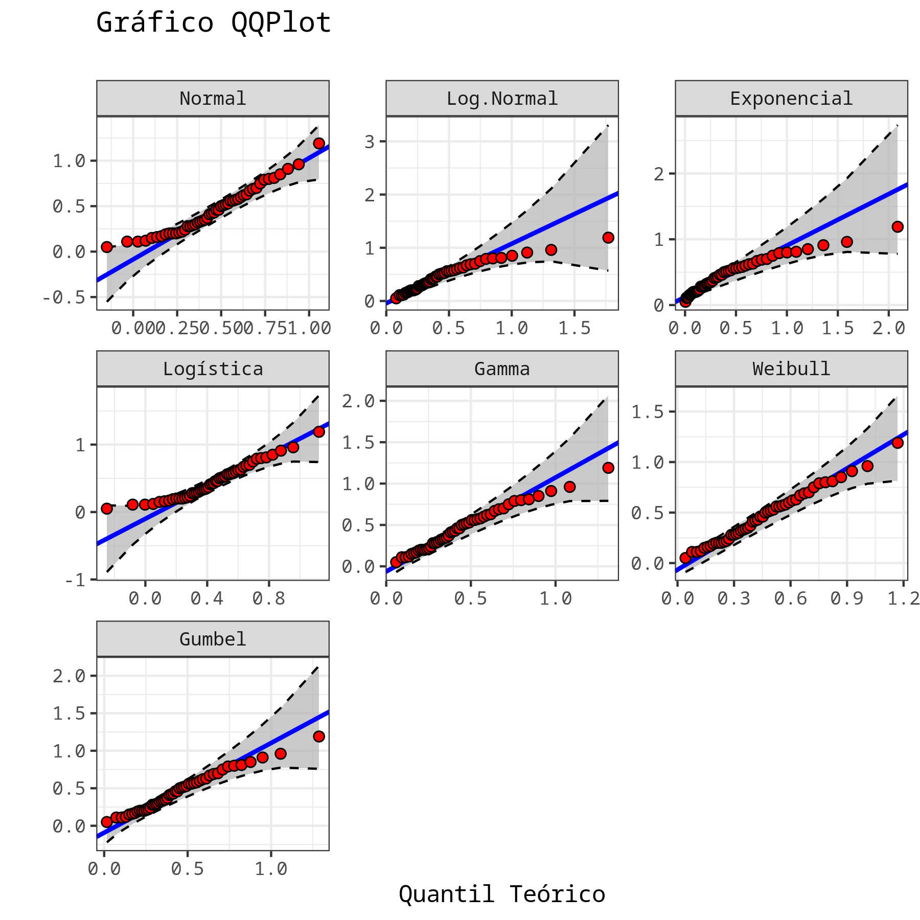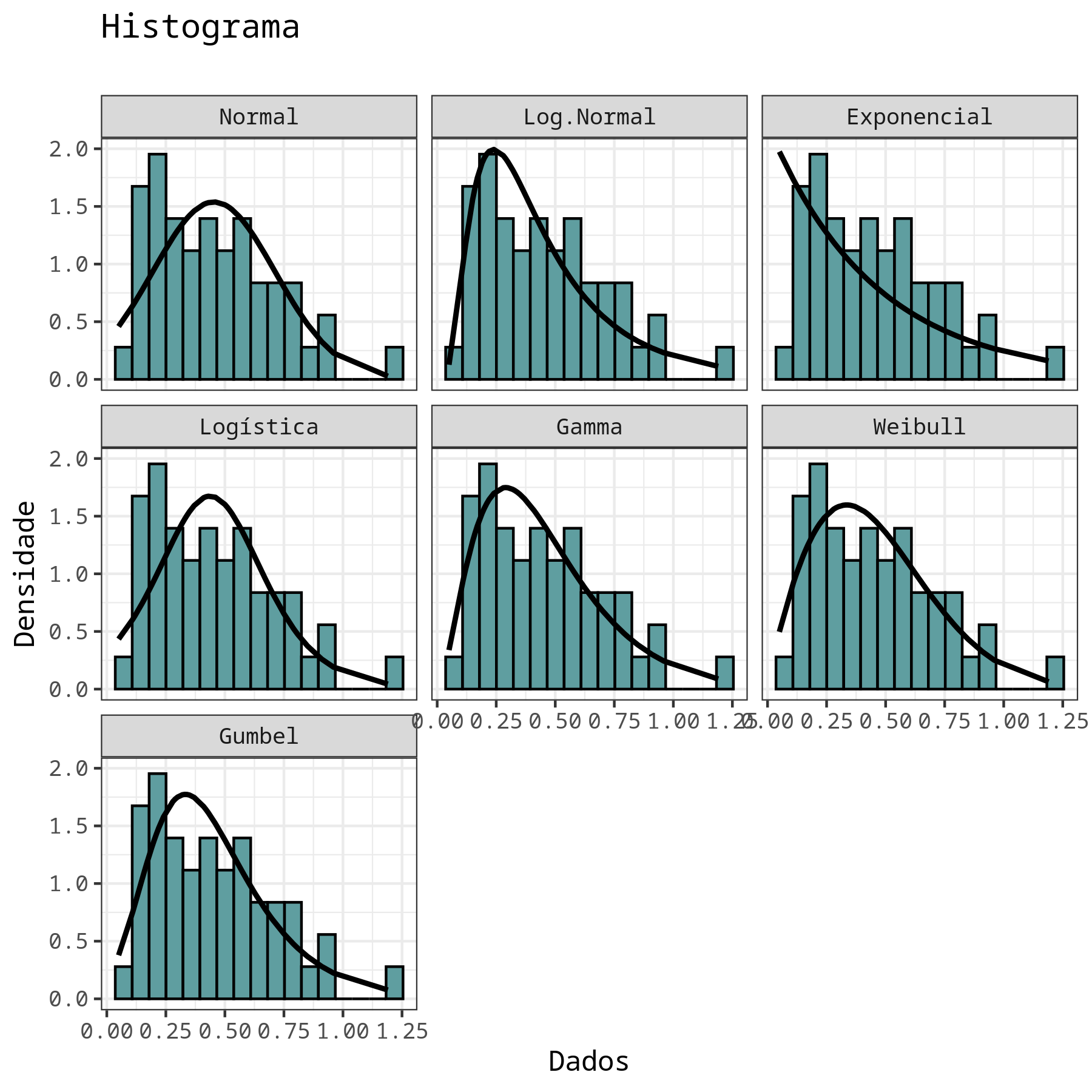 A tabela indica que os dados podem ser melhor ajustados por todas as distribuições exceto Distribuição Exponencial, o que pode ser confirmado quando comparamos o P-valor do teste de Anderson-Darling com o nível de significância de 0,05.