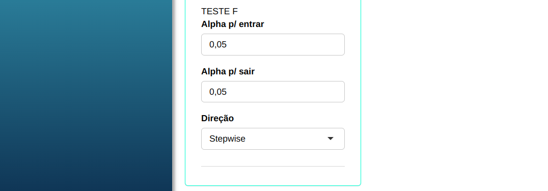 Com os mesmos dados do Exemplo 1, agora aplicaremos o Teste F como critério de seleção.