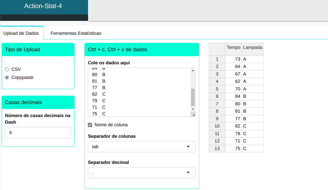 O teste o Kruskal-Wallis será conduzido utilizando as configurações apresentadas na figura abaixo.