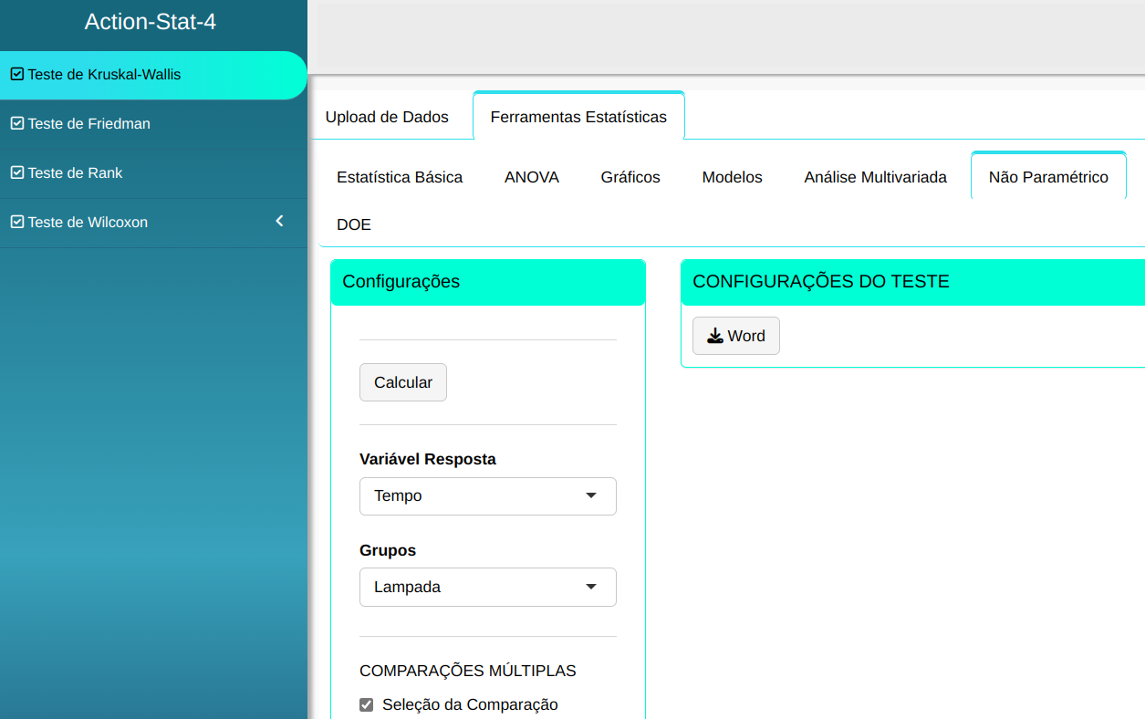 O teste o Kruskal-Wallis será conduzido utilizando as configurações apresentadas na figura abaixo.