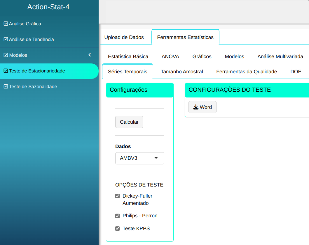 Quase a totalidade dos modelos propostos para séries temporais, apresentam como suposição a estacionariedade. Assim, uma questão fundamental é saber quando que uma série temporal é estacionária. Na ferramenta Testes de Estacionariedade três testes estão disponíveis para verificar a estacionariedade da série.