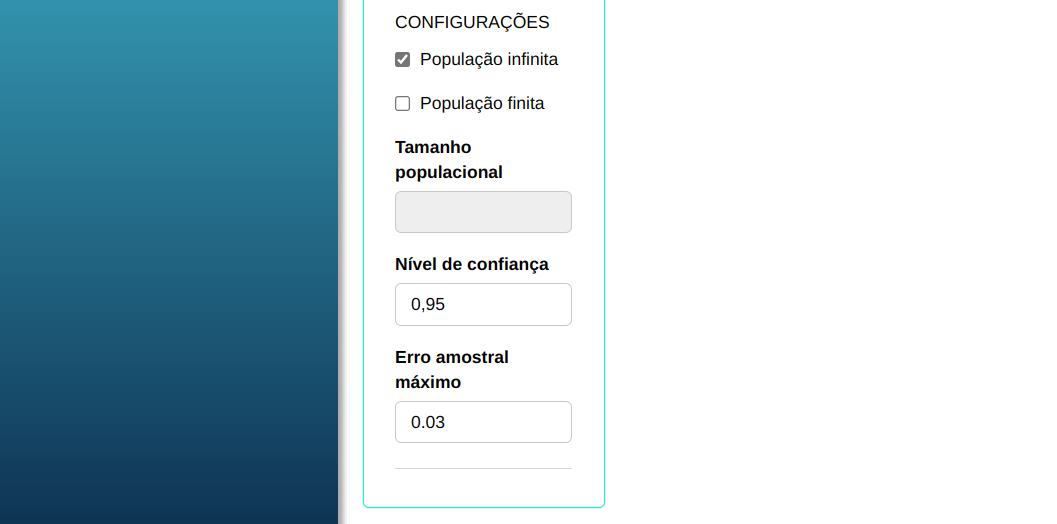 | Proporção amostral | Nível de significância | Erro máximo amostral |