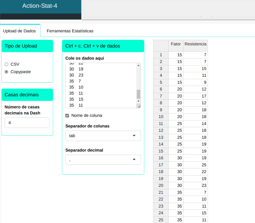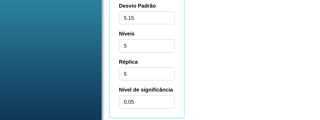 Considere o processo de produção de uma fibra sintética, onde o experimentador quer conhecer a influência da porcentagem de algodão na resistência da fibra. Para isto, foi realizado um experimento totalmente aleatorizado, onde diversos níveis de porcentagem de algodão foram avaliados com respeito à resistência da fibra. Um ponto importante na montagem do experimento é que para cada nível do fator (porcentagem de algodão), os outros fatores que influenciam o processo devém apresentar um padrão homogêneo de variabilidade. No experimento, tomamos 5 níveis para a porcentagem de algodão e 5 replicações. Os valores estão na tabela abaixo: