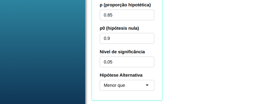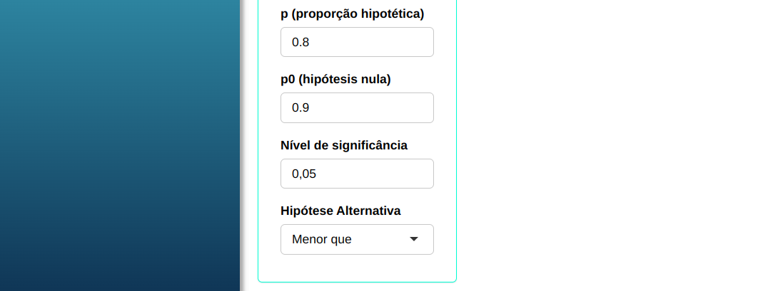 Com isso, concluímos que o teste tem poder de, aproximadamente 99,1% em detectar uma diferença entre a proporção da hipótese nula $p_0$ = 0,9 e uma possível proporção real $p$ = 0,8.