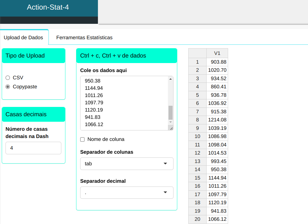 Utilizando a ferramenta Resumo descritivo do menu de Estatística Básica do Action, temos que a média amostral é $\overline{X}=$ 1019,3685 e o desvio padrão amostral é s $=$ 91,36863255.