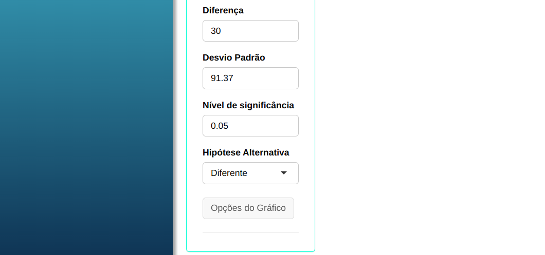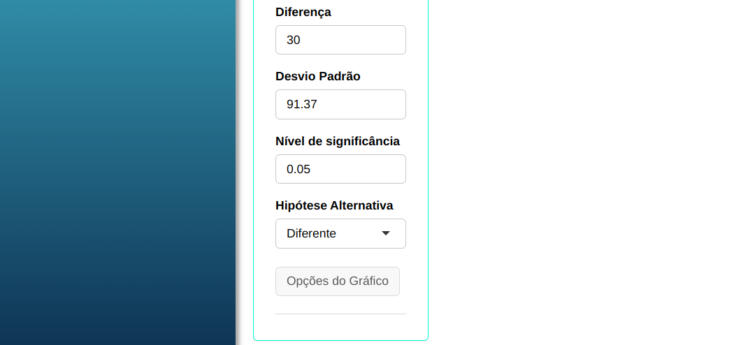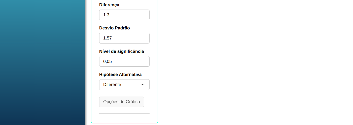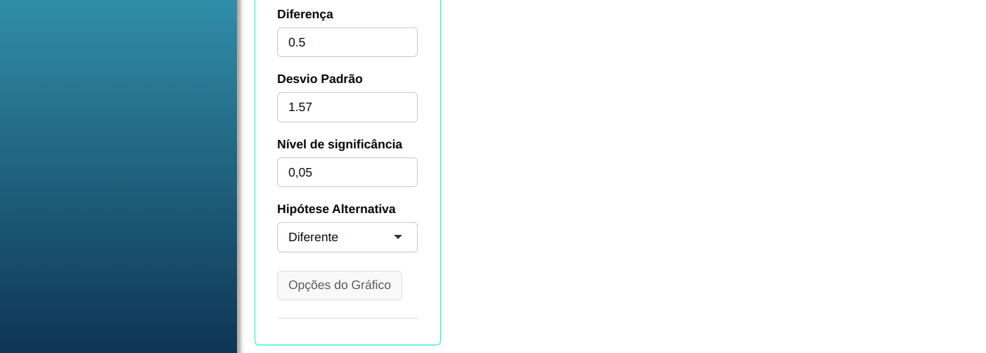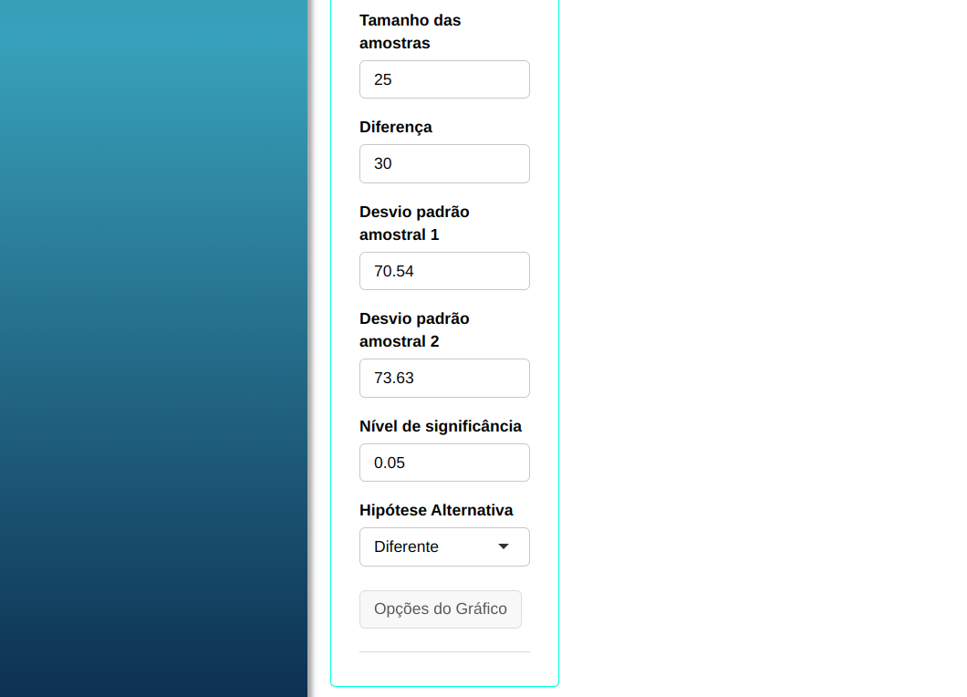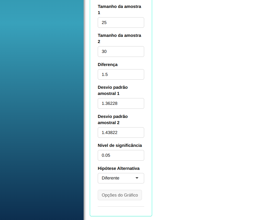 | $\mathbf{n_1}$ | $\mathbf{n_2}$ | $\mathbf{\alpha}$ | Diferença $\mathbf{(\mu_1 - \mu_2)}$ | Desvio-Padrão 1 | Desvio-Padrão 2 |