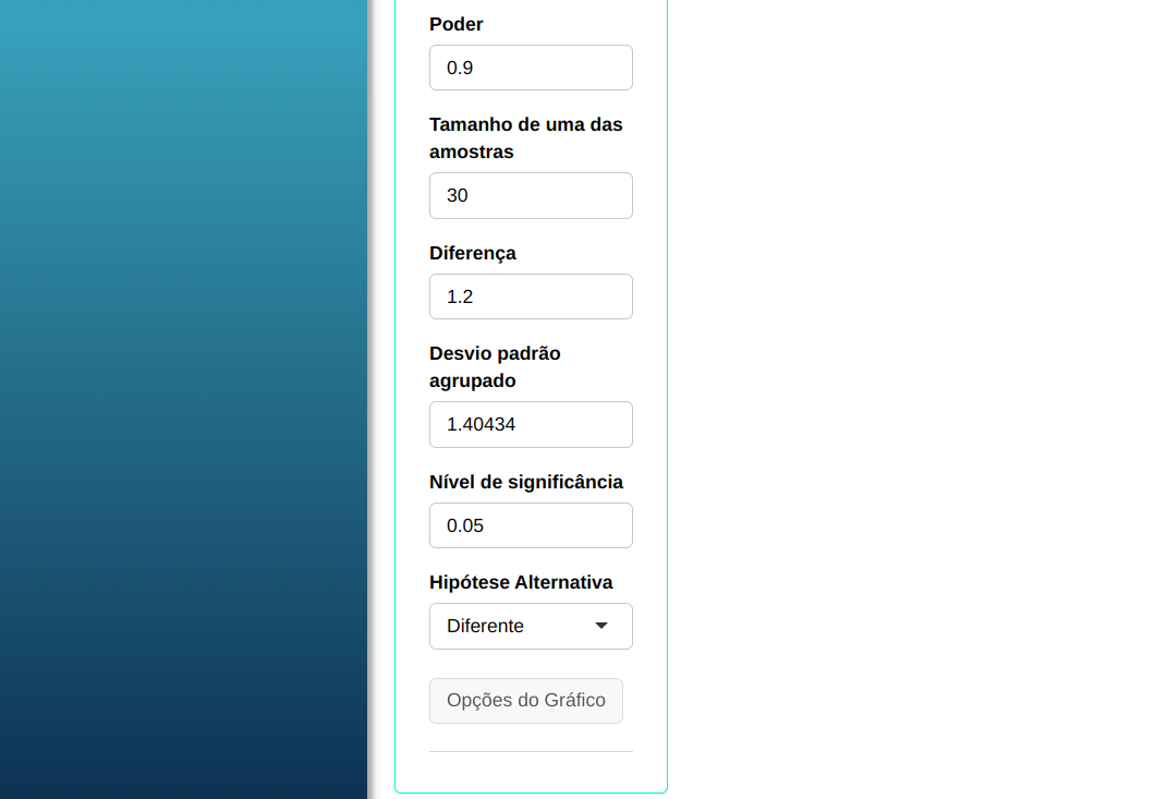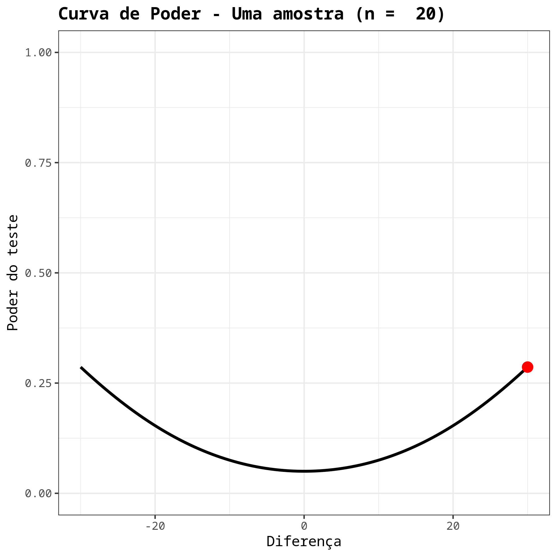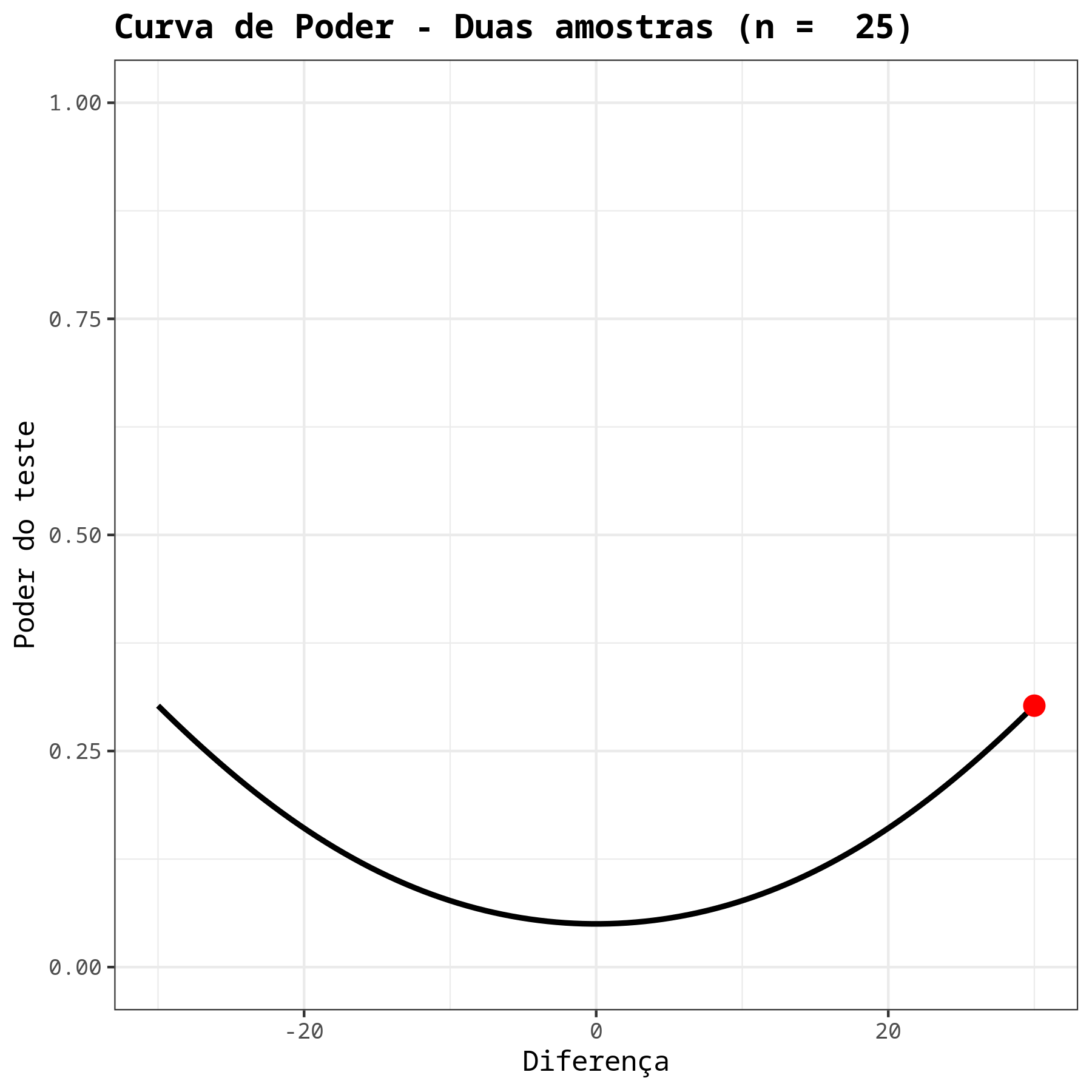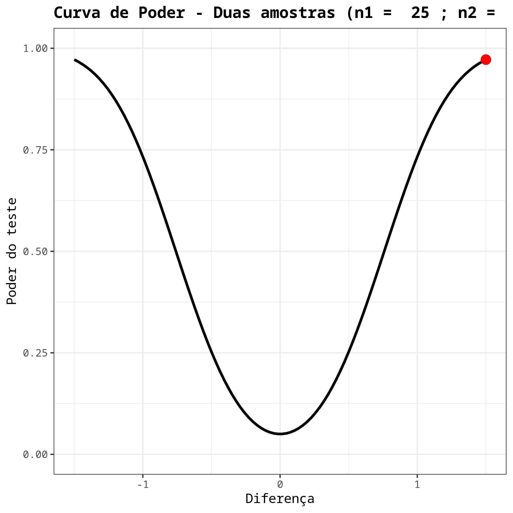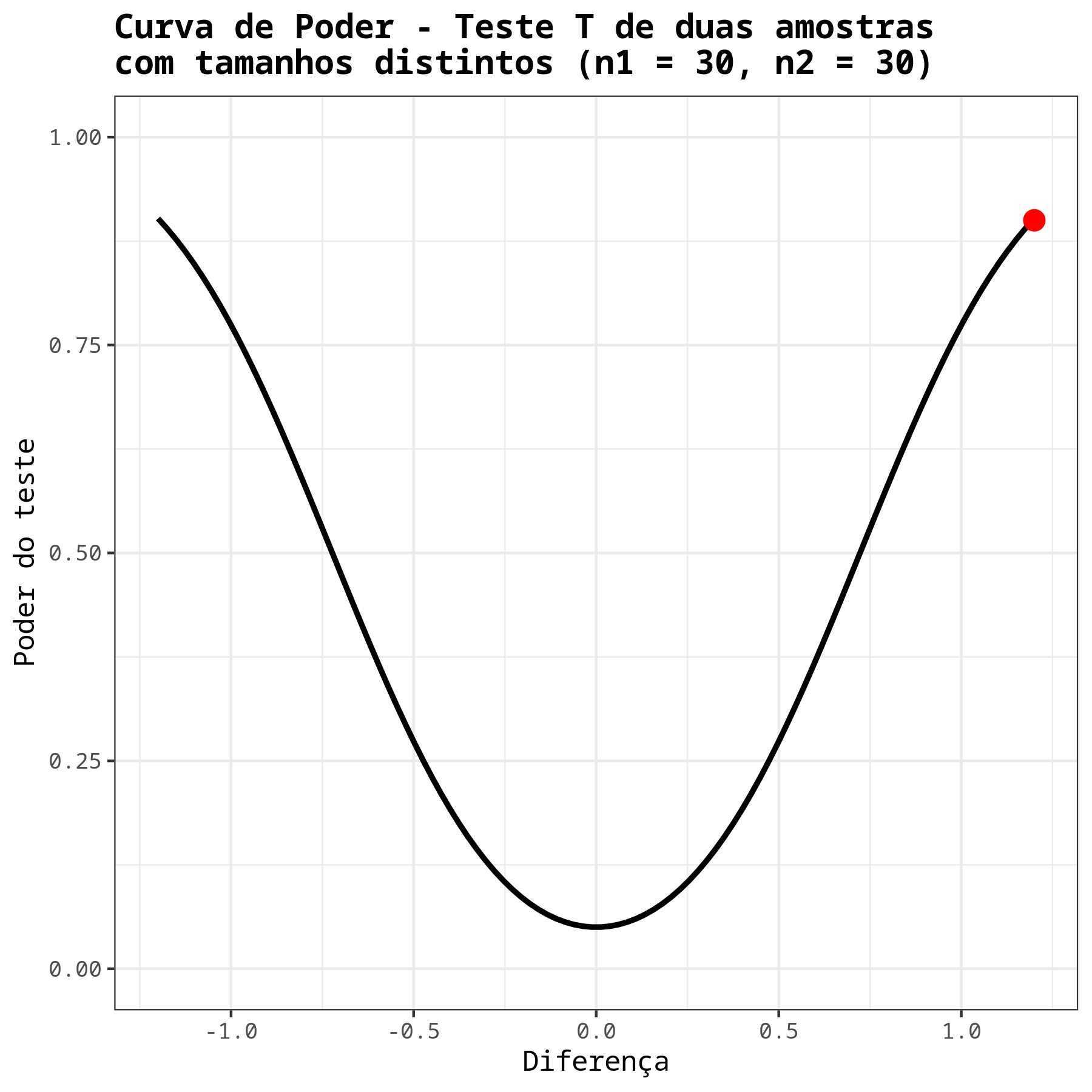 Concluímos então que, com uma das amostras com 30 elementos, para detectar uma diferença de 1,2 com um poder de, no mínimo, 90%, é necessário que a outra amostra também tenha aproximadamente 30 elementos.