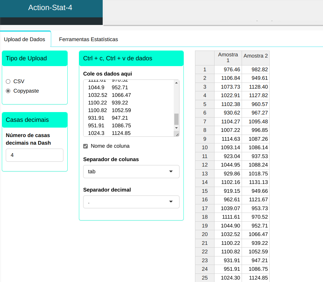 onde $\mu_D$ será estimado pela média amostral das diferenças, ou seja, D. Utilizando a ferramenta Estatística Básica do Action, temos que a média amostral é D = -0,110499 e o desvio padrão amostral é S = 1,56907778