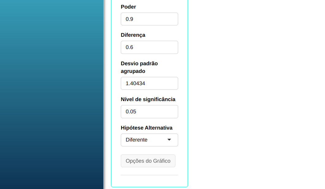 Suponha agora, com o mesmo conjunto de dados, que queiramos calcular o tamanho amostral necessário para que se detecte uma diferença $\mu_1 - \mu_2 =$ 0,6 com um poder de, no mínimo, 0,9 e um desvio padrão de 1,40434.