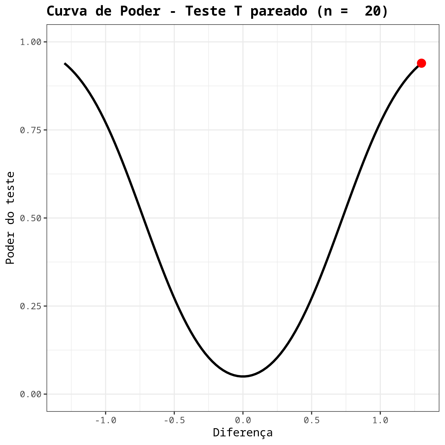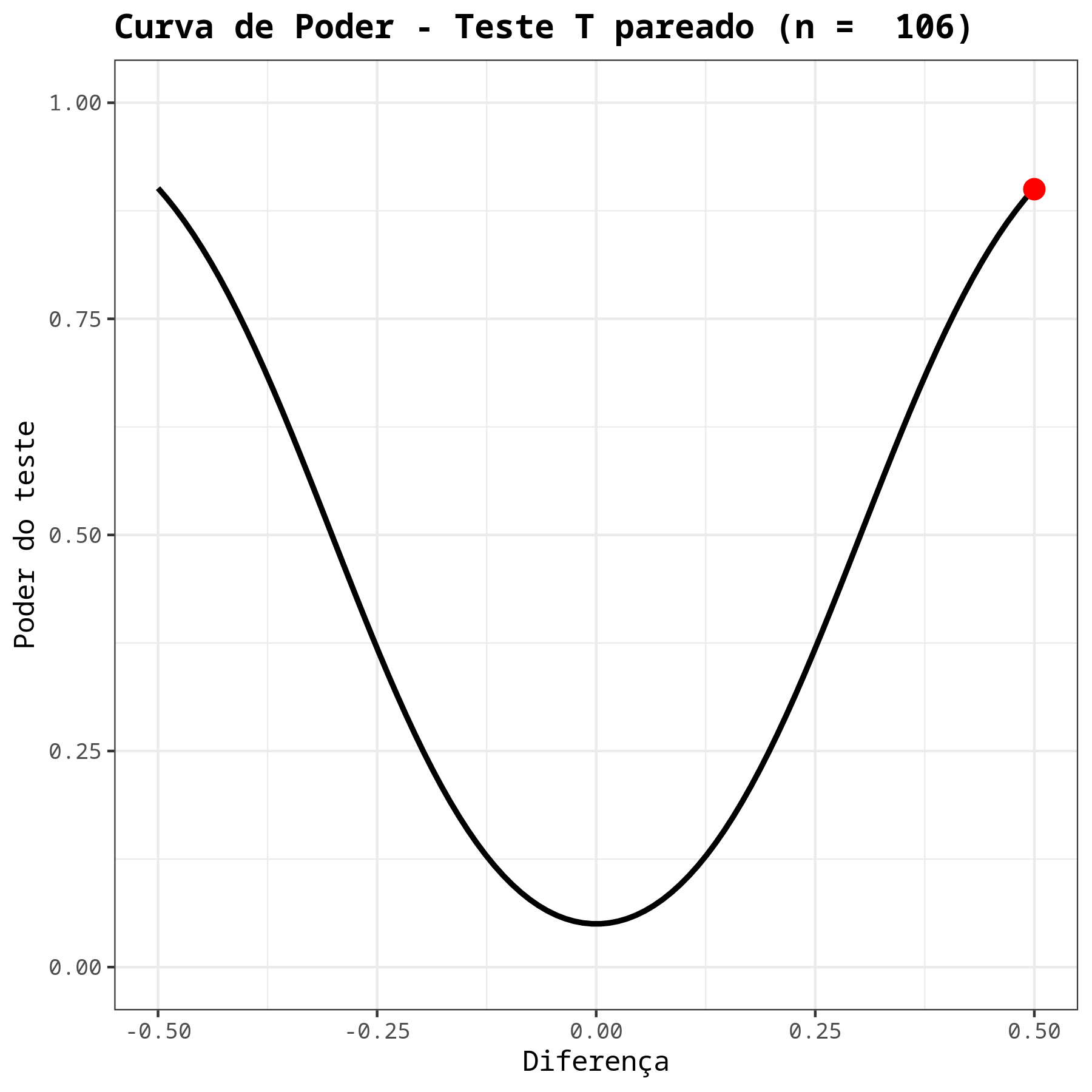 Portanto, para que o teste detecte uma diferença 0,5 no teste de hipóteses com um poder de, no mínimo 0,9 é necessário um tamanho amostral de, no mínimo, n = 106.