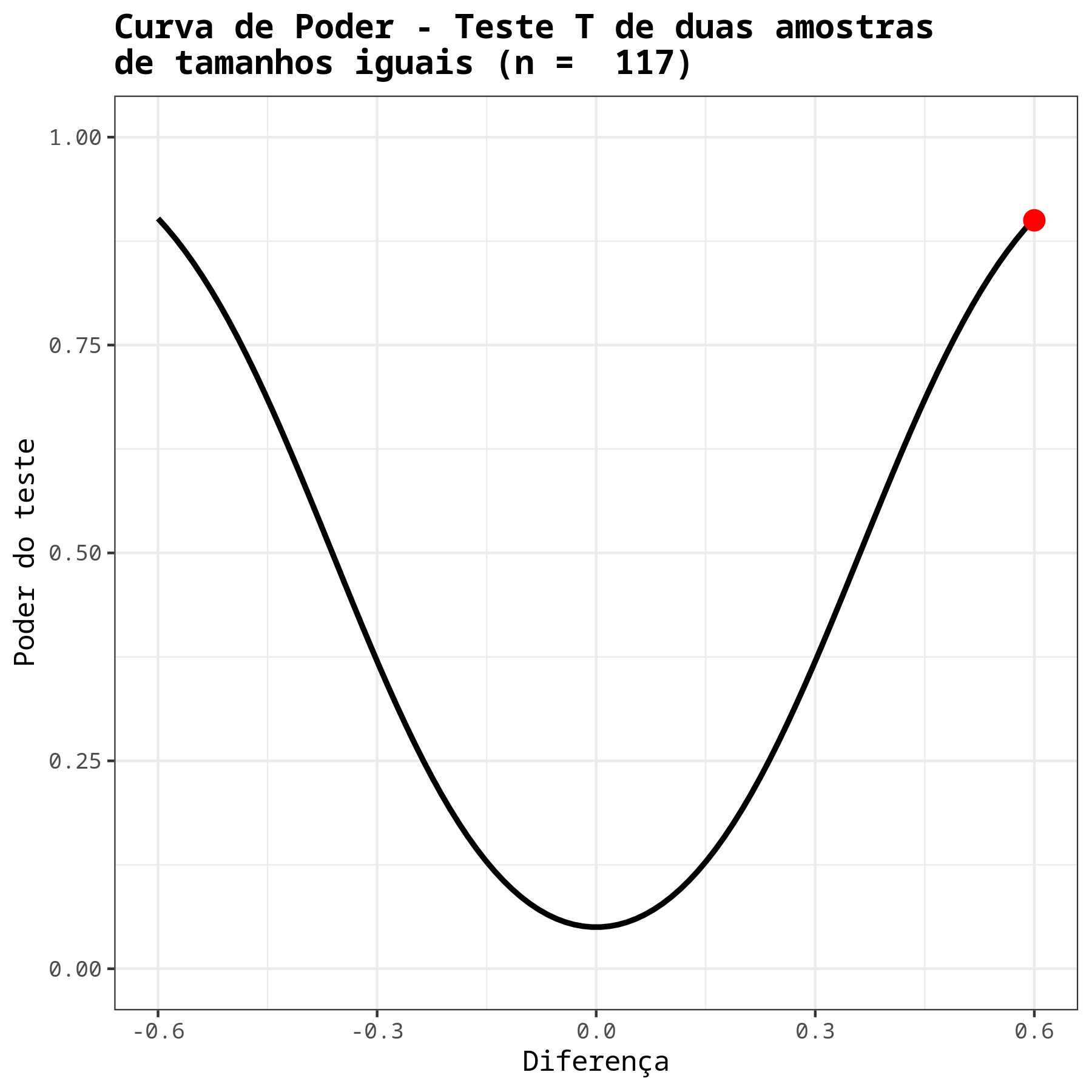 Concluímos então que, para detectar uma diferença de 0,6 com um poder de, no mínimo, 0,9, é necessário que as duas amostras tenham 117 elementos.