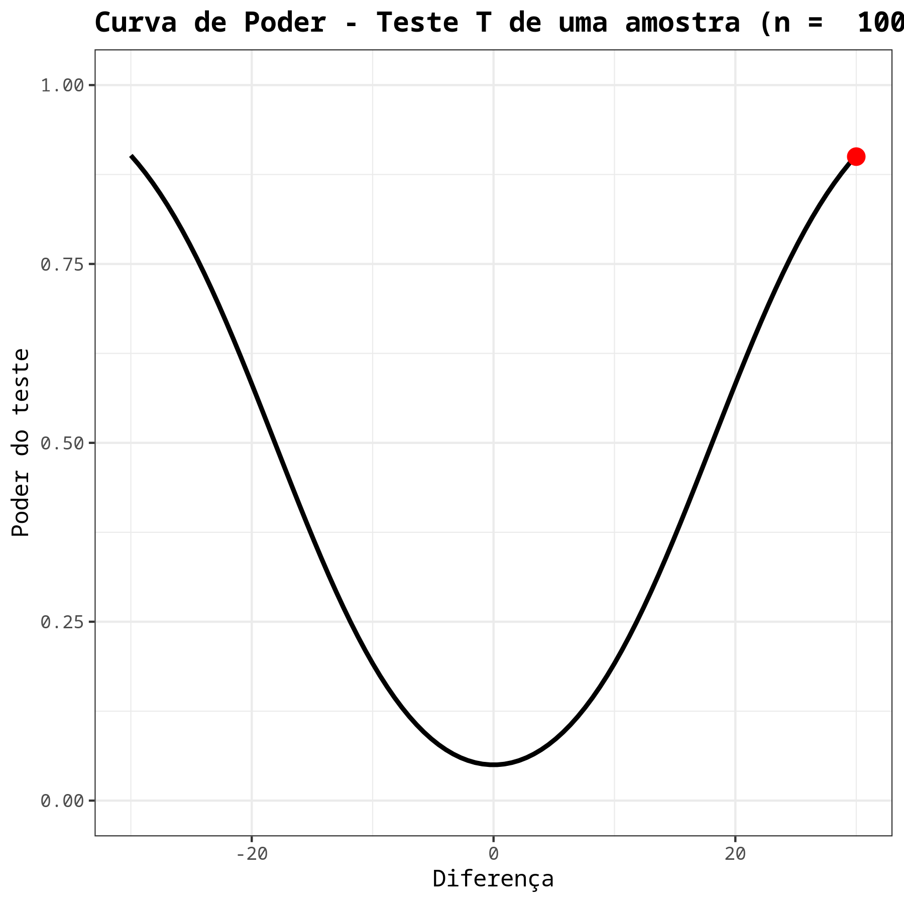 Para calcular o Poder de um teste de hipóteses, calculamos a probabilidade de se rejeitar a hipótese nula quando esta é realmente falsa, ou seja, a hipótese alternativa é verdadeira. Assim, assumimos um valor x para a hipótese alternativa e o poder do teste é a probabilidade que o teste possui de detectar a diferença d entre o valor x da hipótese alternativa e o valor da hipótese nula.