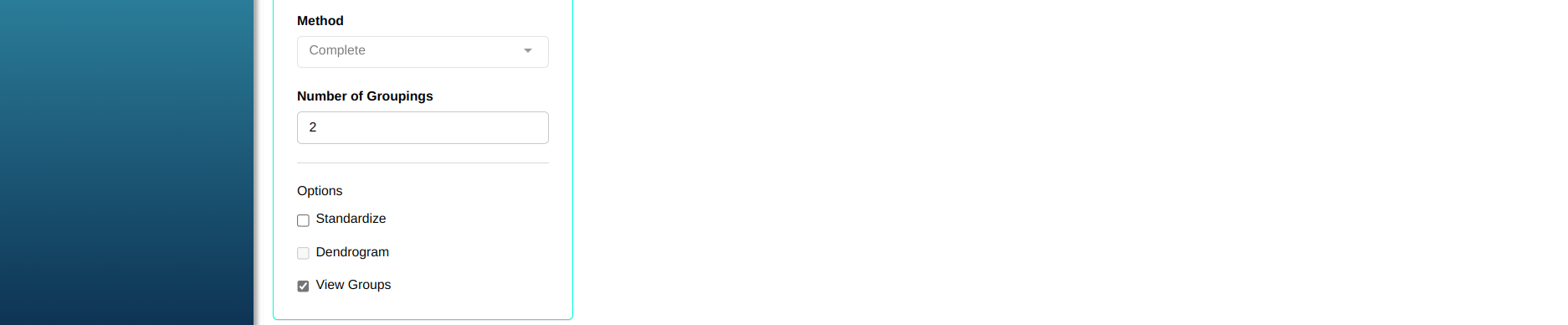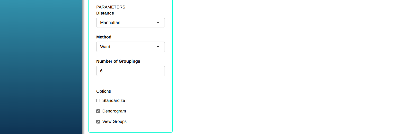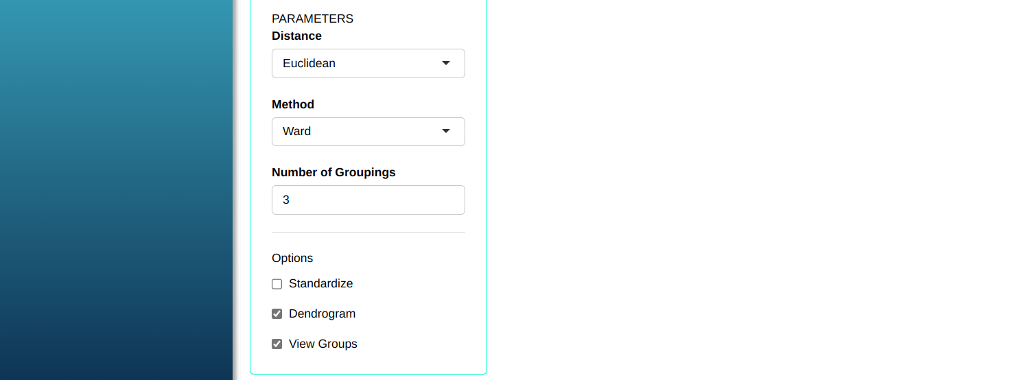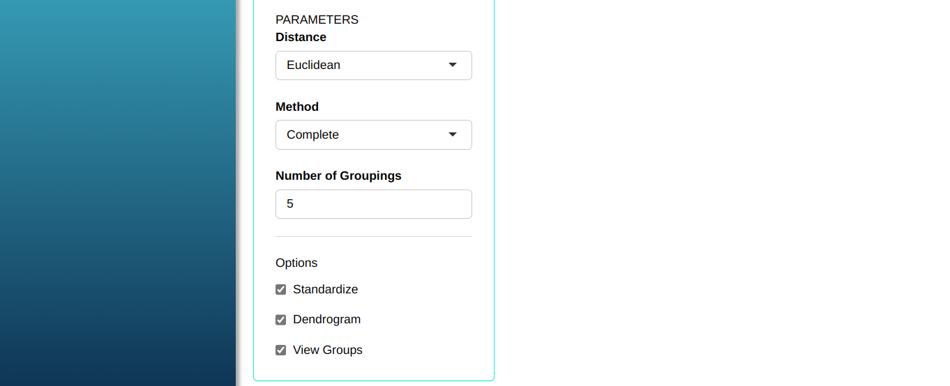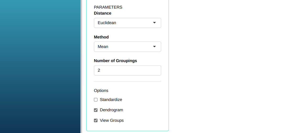 For the hierarchical method, you can choose the distance parameters (Euclidean, Manhattan or Gower) and the method (ward, single, complete, average, median or centroid). There are options to standardize the data, display the data in a dendrogram and display groups.
