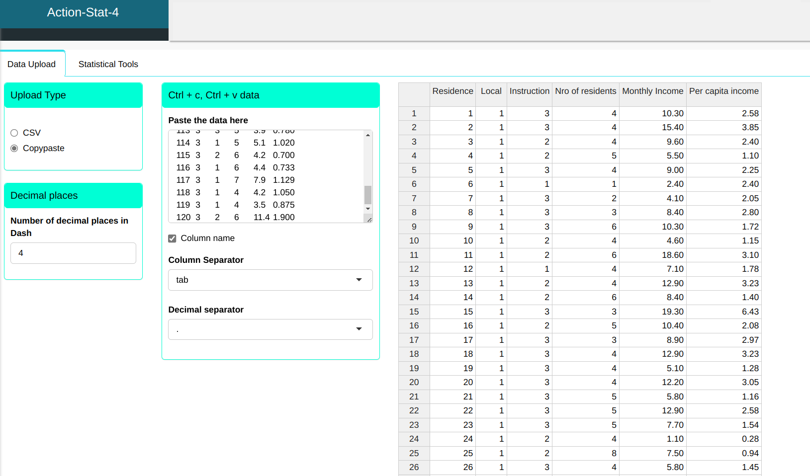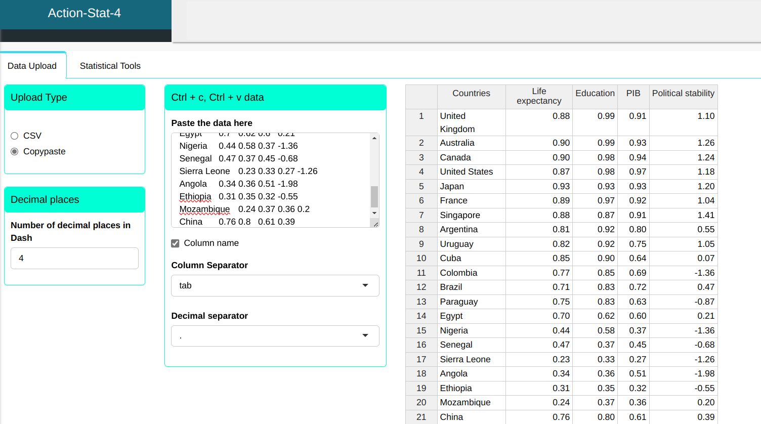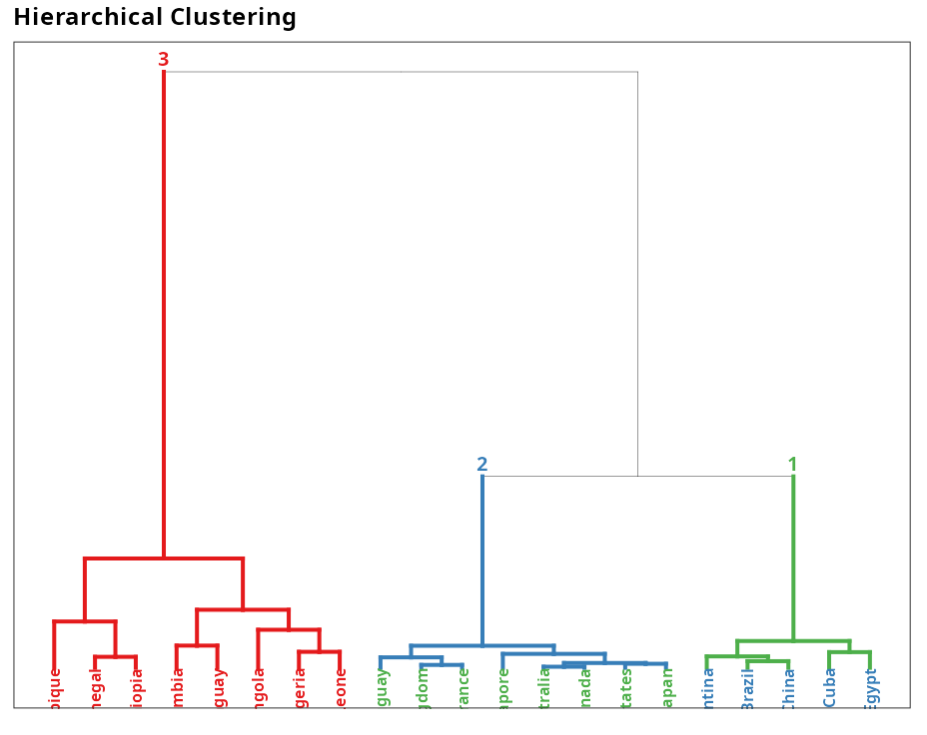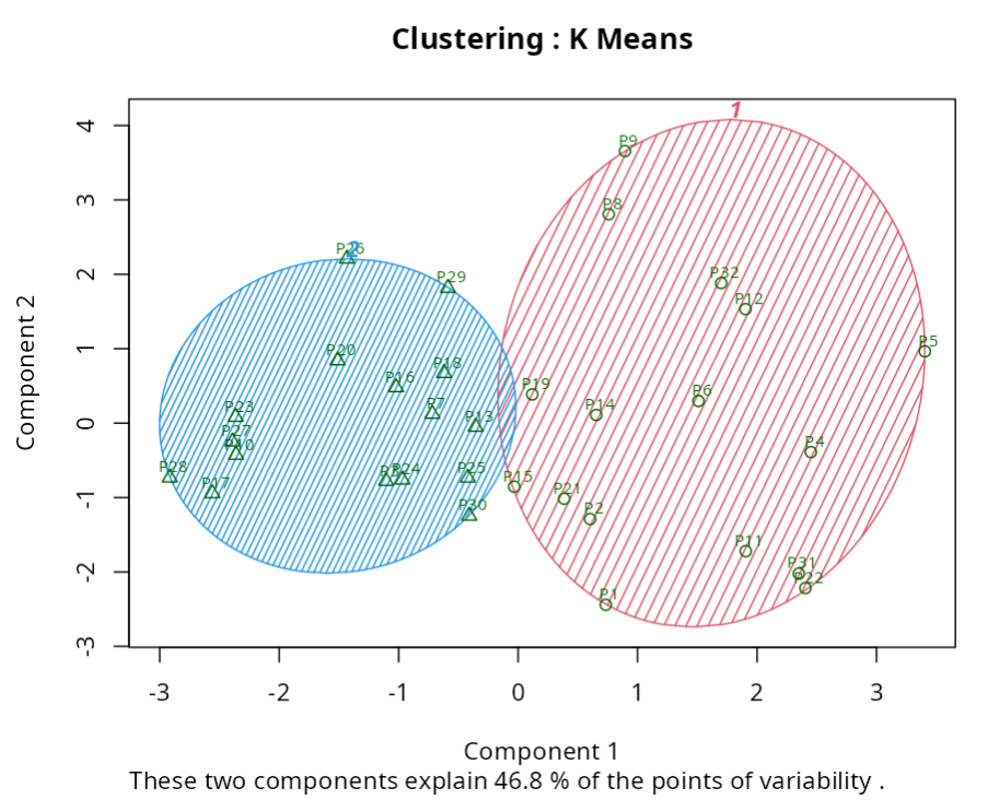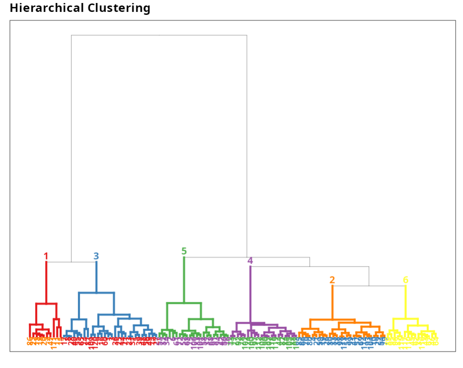 For the hierarchical method, you can choose the distance parameters (Euclidean, Manhattan or Gower) and the method (ward, single, complete, average, median or centroid). There are options to standardize the data, display the data in a dendrogram and display groups.