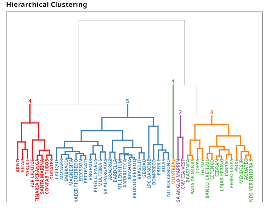 A financial analyst would like to segment the companies analyzed according to the factors that impact their financial health. The consumer goods manufacturer, after mapping the market structure and determining the factors that differentiate the products, would like to segment them. We will apply Cluster Analysis using the hierarchical complete linkage method using Euclidean distance to compare groups.