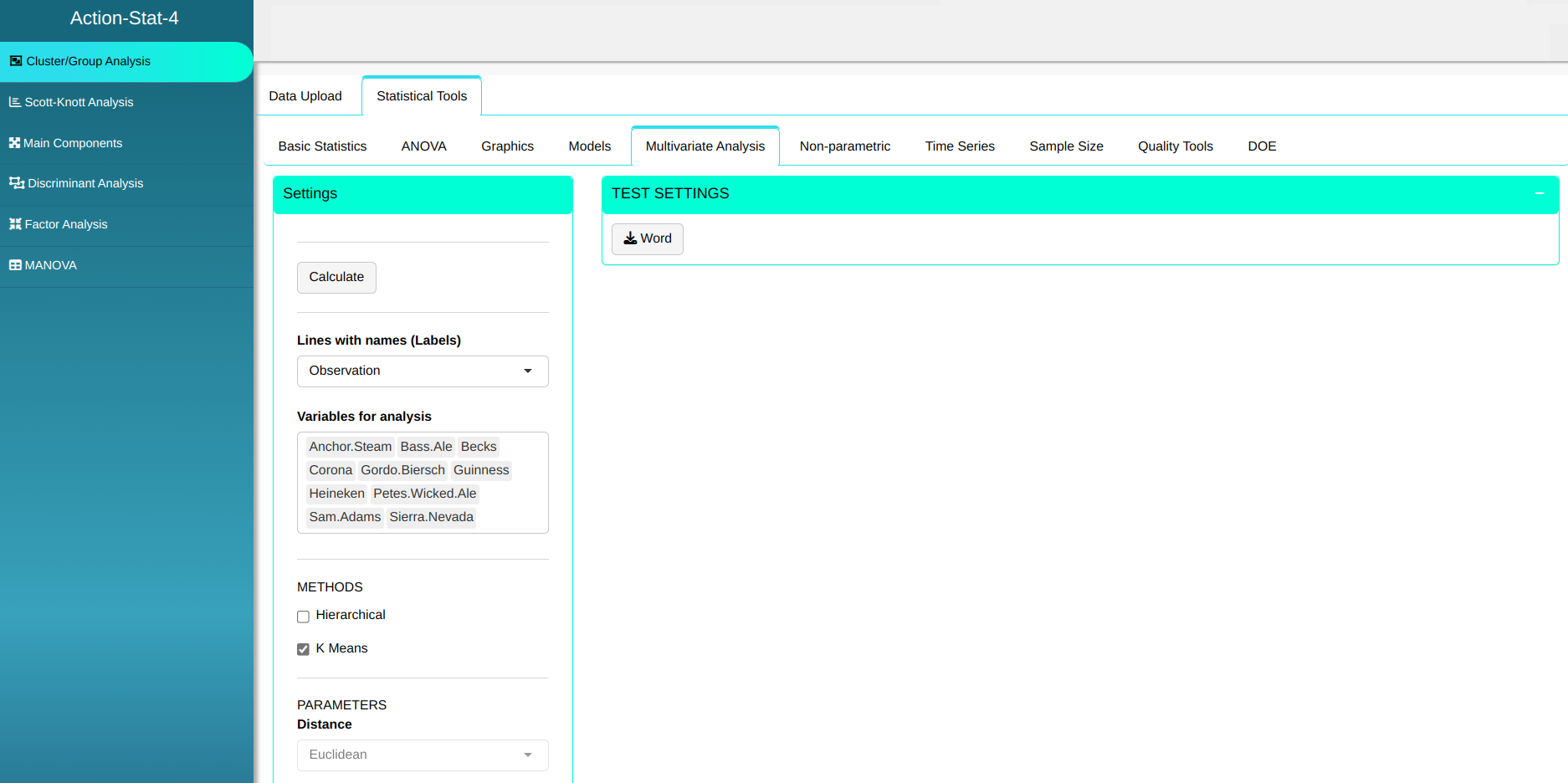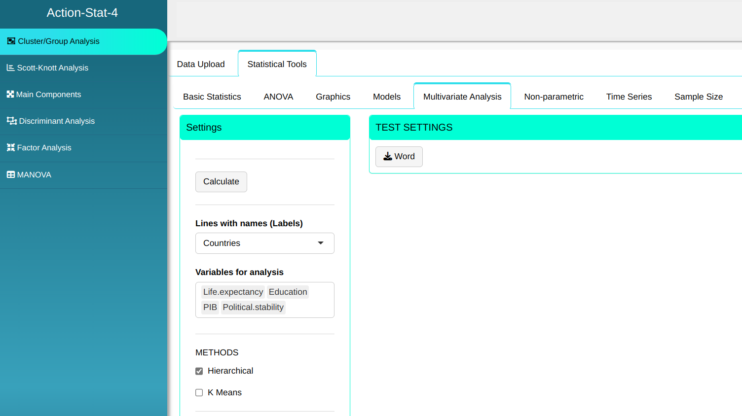 For the hierarchical method, you can choose the distance parameters (Euclidean, Manhattan or Gower) and the method (ward, single, complete, average, median or centroid). There are options to standardize the data, display the data in a dendrogram and display groups.