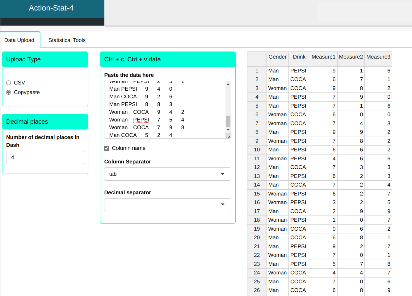 | Gender | Drink | Measure1 | Measure2 | Measure3 |