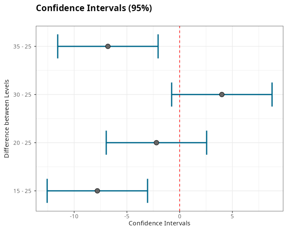 The interpretation of the Dunnett test is similar to that of the Tukey test, that is, equality between levels will be rejected if the P-value is greater than the alpha or if the confidence interval does not contain the value "zero". Thus, in the example, we reject the hypothesis of equality between the levels 15 and 25 and between levels 35 and 25. For other comparisons, no significant difference was detected.