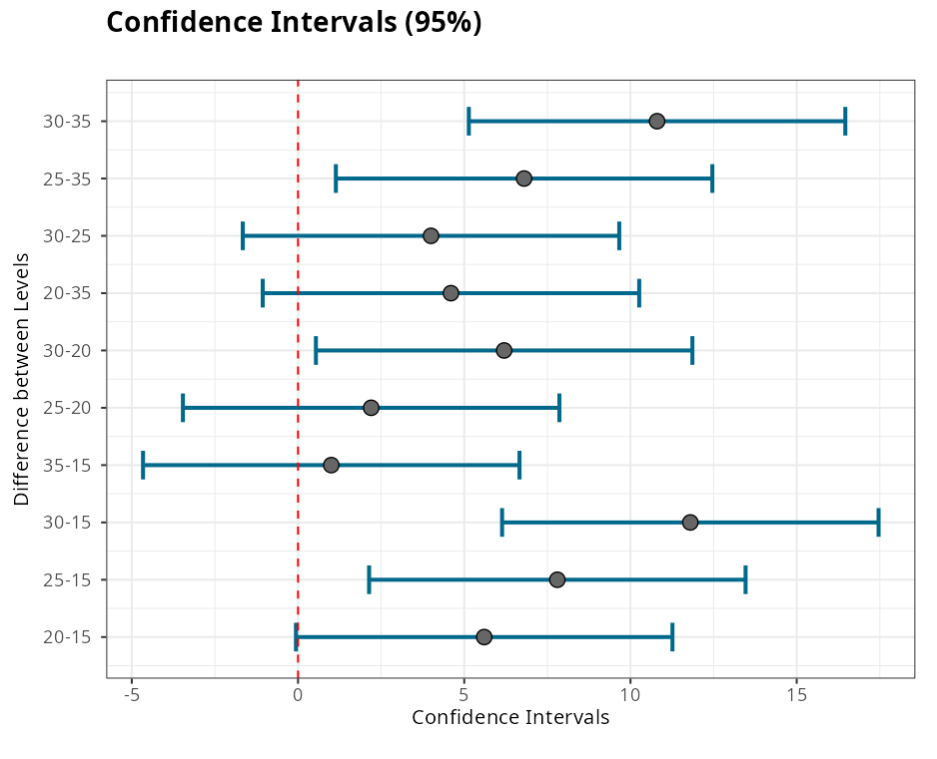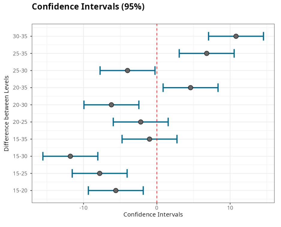When considering a 5% significance level, we do not reject the hypothesis of equality between level means: 20-15, 35-15- 25-20, 20-35 and 30-25.