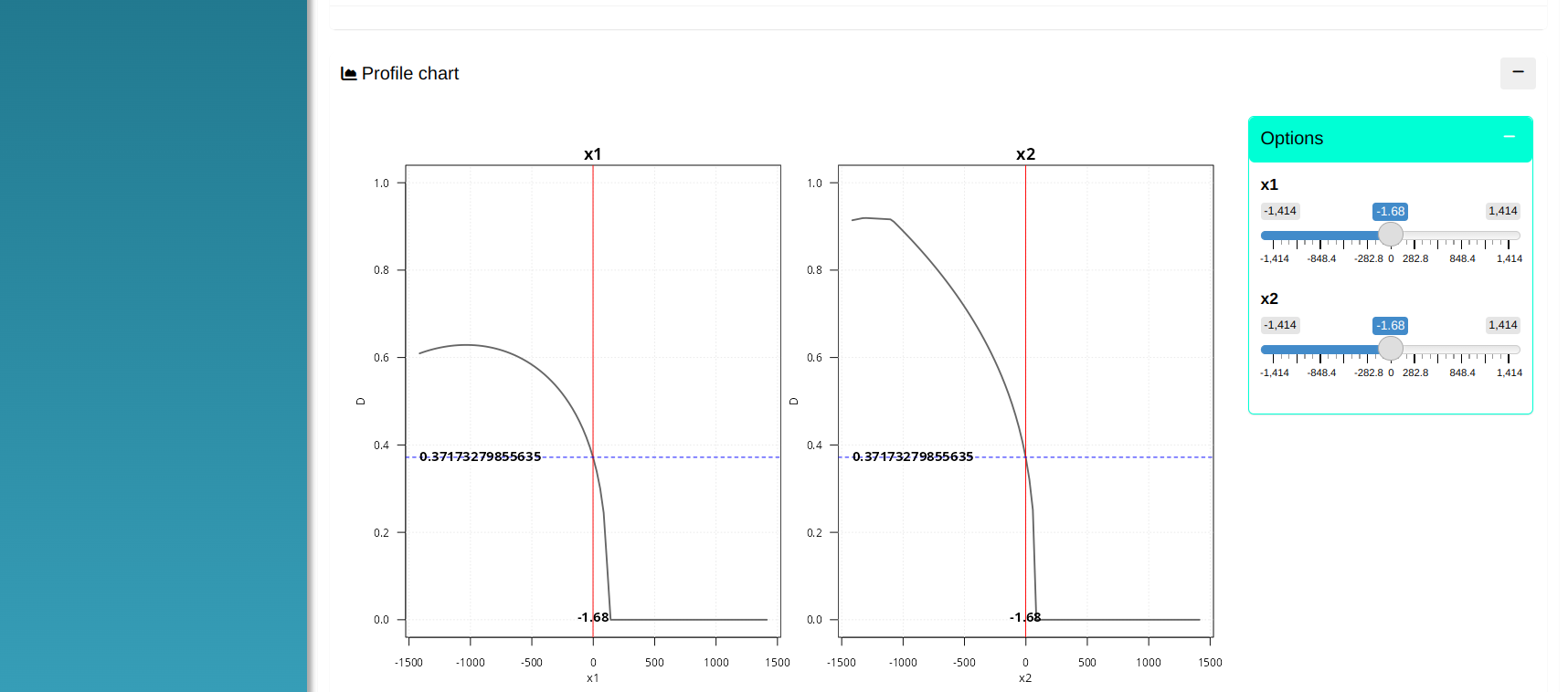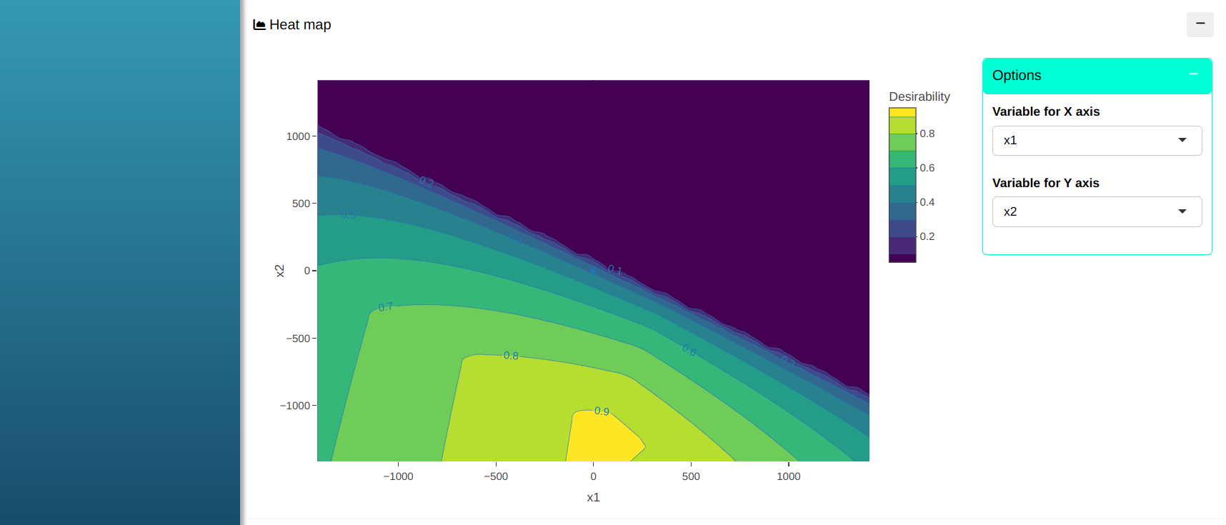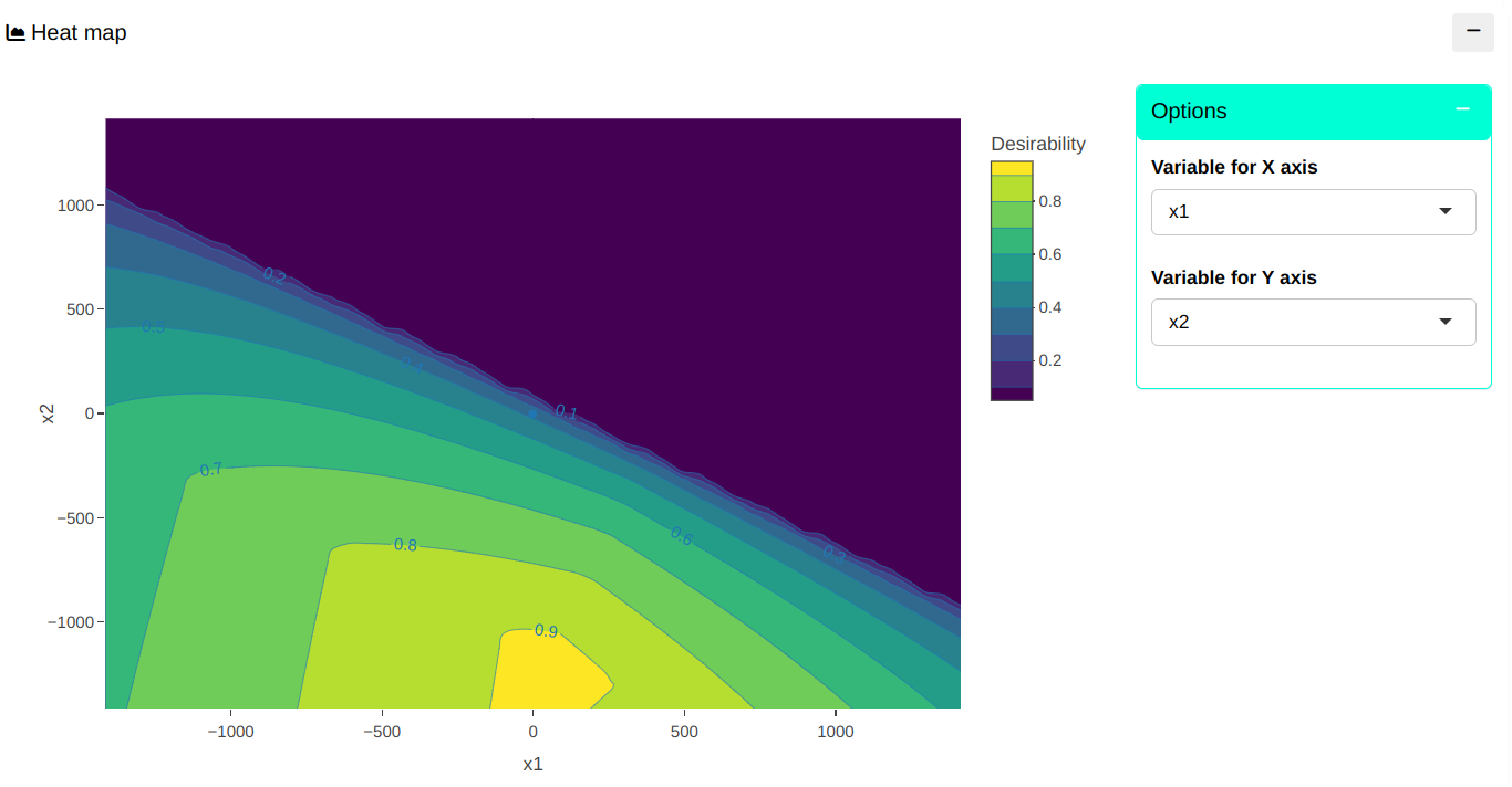 Clicking on the “Desirability” menu shows the best solution along with the heat map.