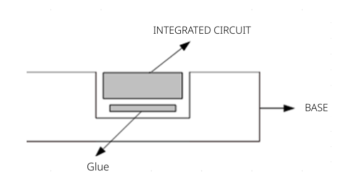 Process of gluing an integrated circuit to a base.