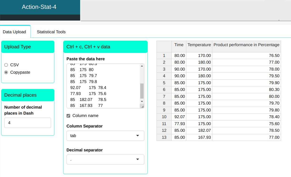 (Montgomery, 1985) In the analysis of a chemical process we will develop a 2nd order response surface model to relate time reaction rate and temperature in relation to product performance. at the table, we have the original data before composition planning central.