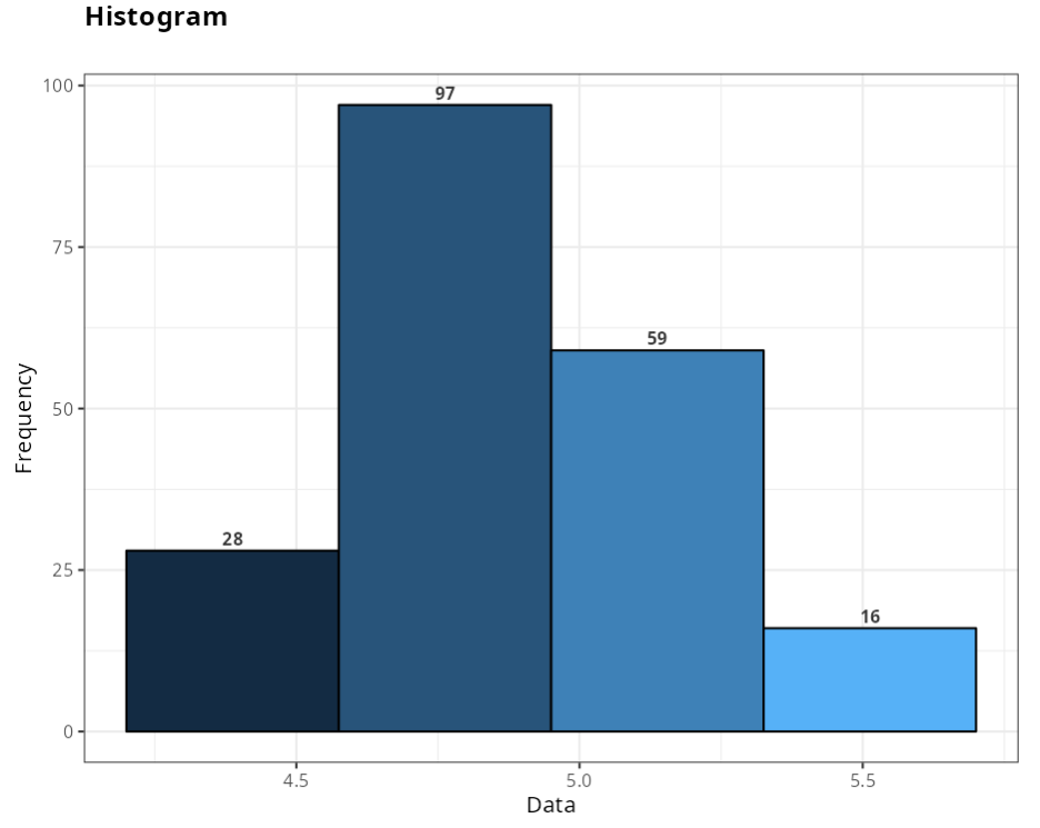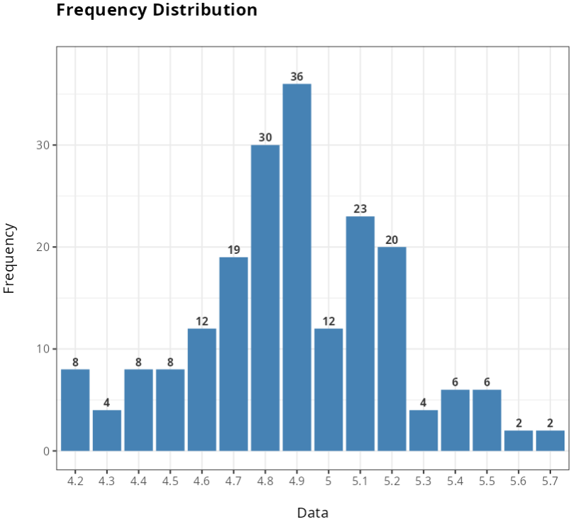 With result, we get the data count. Note that the data is most concentrated between values 4.6 and 5.2.