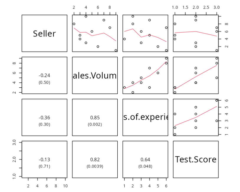 We see, initially, that the positive correlation (0.846) between the volume of sales and years of experience are significant (proven by the p-value of 0.0020), lower than the adopted significance level of 5%. Same There is a significant association between sales volume and score in the intelligence test and between the years of experience and the score.