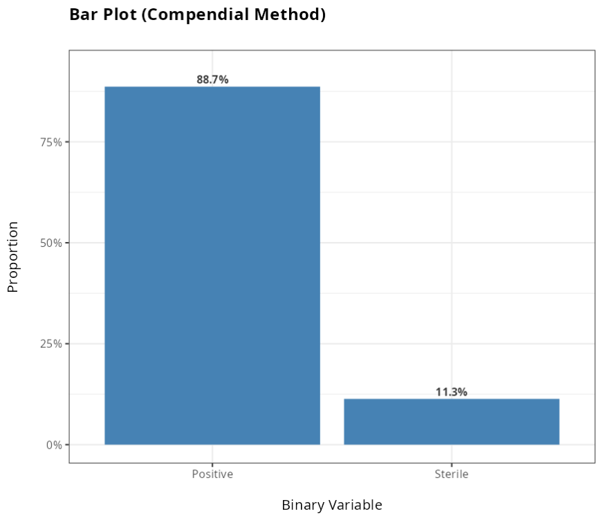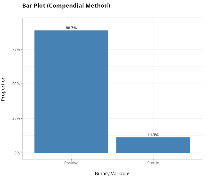 In this example we want to test whether a new methodology is equivalent to the compendial methodology. To do this, we evaluate the proportion of positive results for both methods. The summarized data are given in the following Table