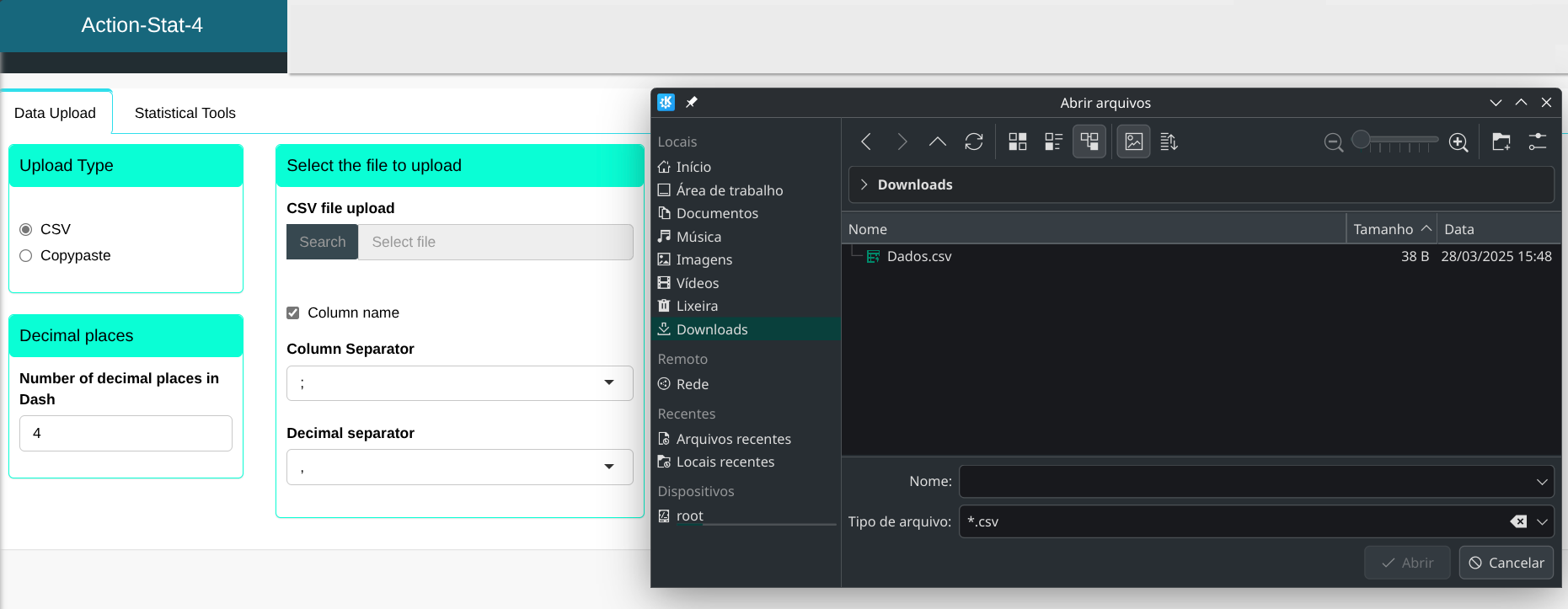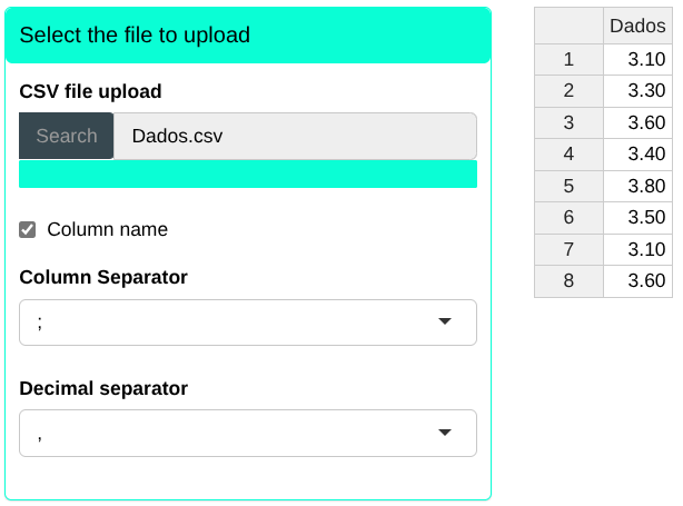 It is worth mentioning that the character selected as a column separator has to be the same as separating the columns in the dataset (in the case of example, semicolon), and the same goes for the selected character as a decimal separator (if different is selected, the system will not will understand the data as numerical and will give an error in the analysis).