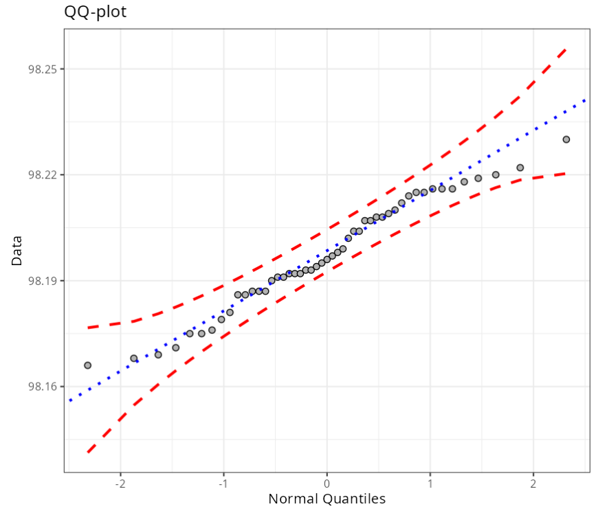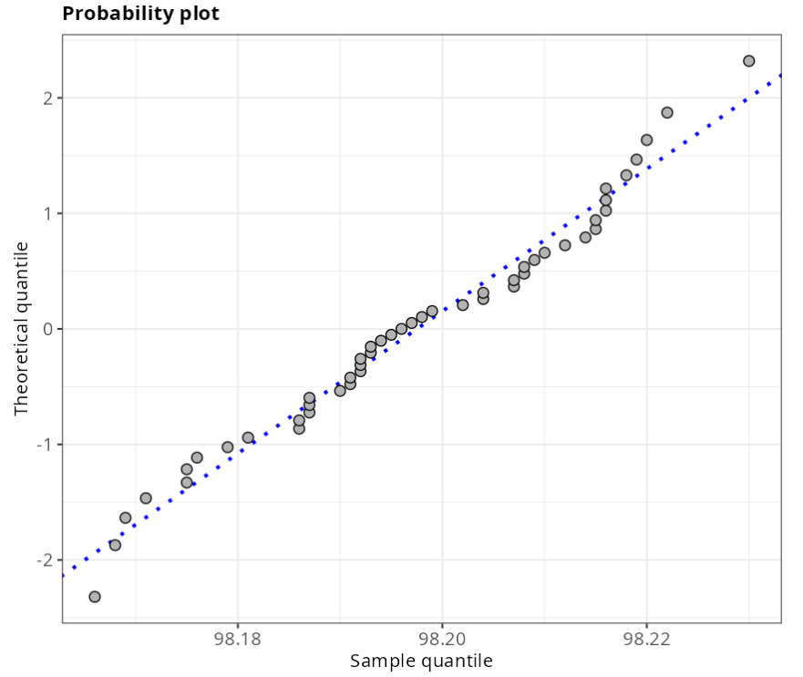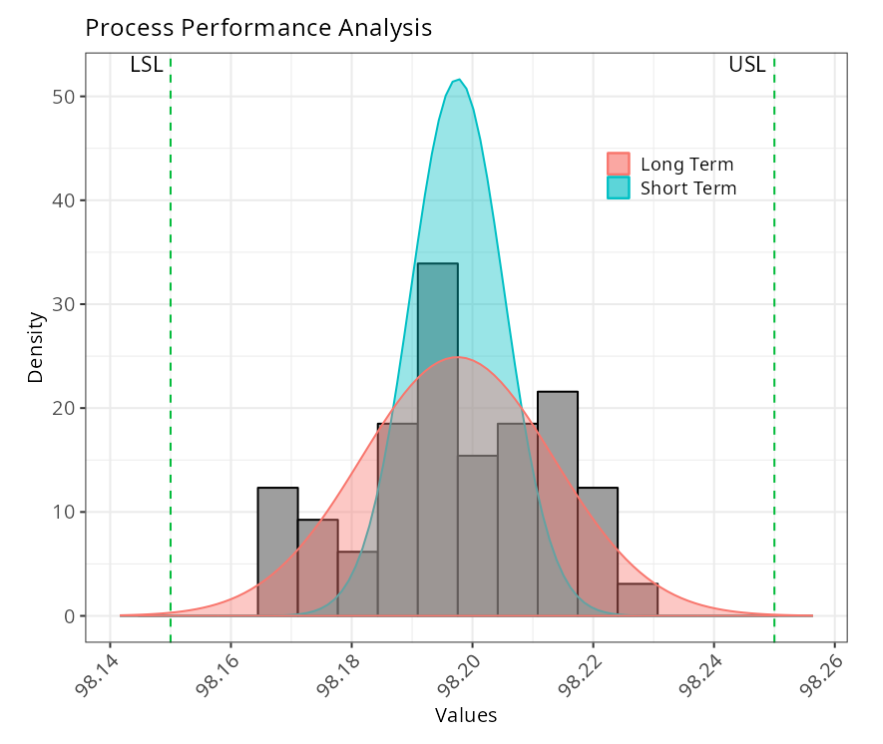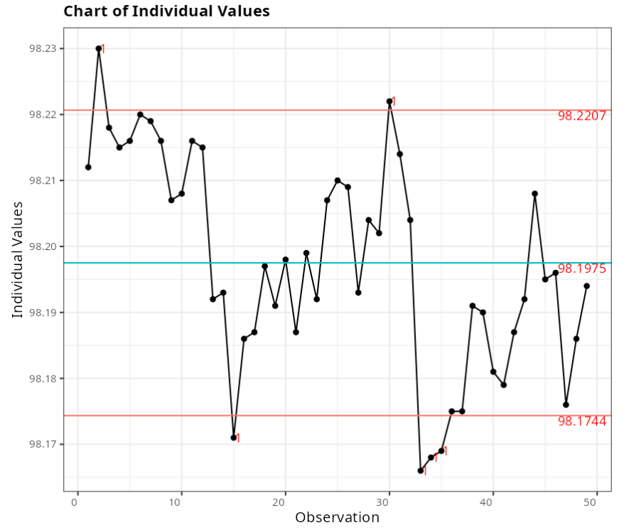 The following data refers to checking the distance between the teeth of a transmission gear. Every thirty pieces produced, the last piece was taken to the laboratory to be measured on a coordinate measuring machine. For this example we have LSL = 98.25 e USL = 98.15.