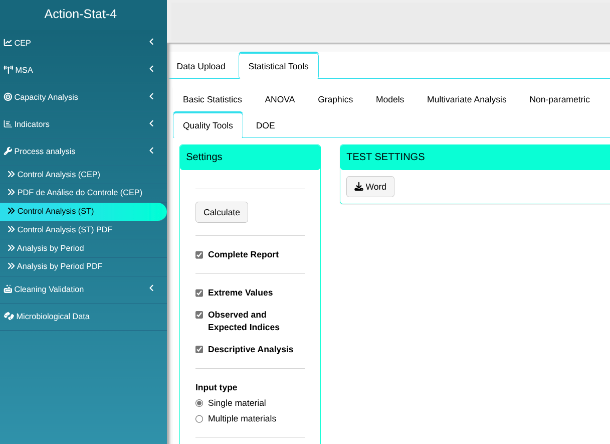 The ANVISA guidelines require that various pharmaceutical industries perform a statistical evaluation of in-process control results and finished product results. The methodology presented here is well-founded and follows the requirements of the ANVISA Guidelines (2012). Action Stat provides a statistical tool that allows for the generation of complete product quality review reports containing a statistical methodology that follows the following flow: first, an exploratory analysis of the results is performed with a descriptive summary and a BoxPlot graph. A distribution fit test is then performed. Next, process stability is evaluated using control charts. A subsequent evaluation of process capacity and performance is performed, followed by a multiple batch comparison test.