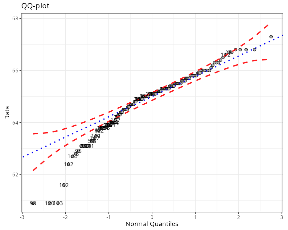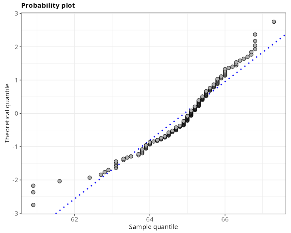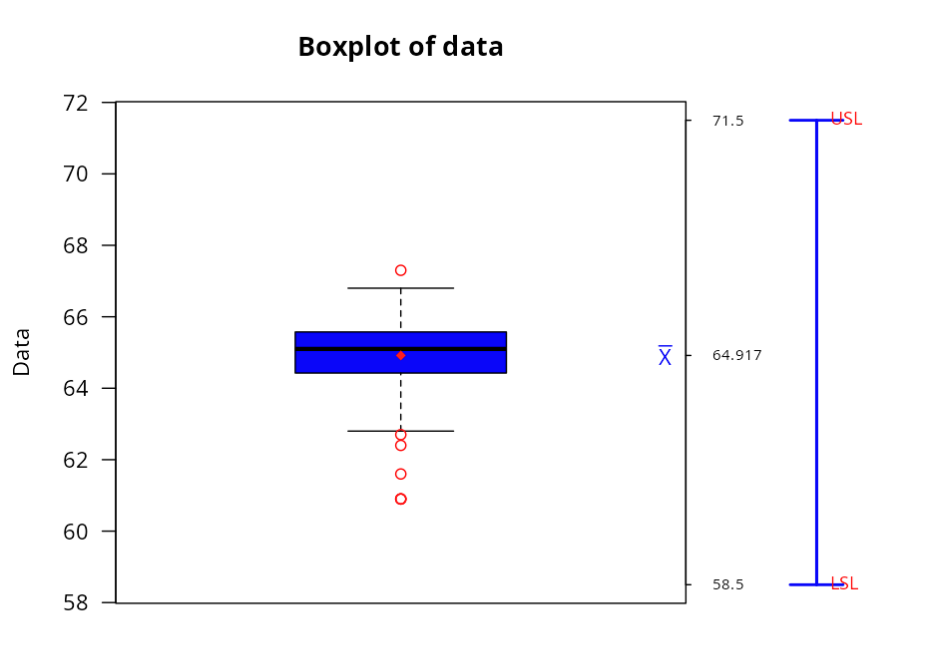 An analyst measured the weight of a substance for 160 production batches of a particular product over the course of a year. The specifications were defined as LSL = 58.5 mg and USL = 71.5 mg. The objective is to generate a complete statistical process review report: