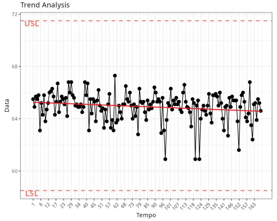 To assess the stability of results over time, analysis using CEP charts is most often used. However, this technique is recommended only in cases where there are few subgroups of data. The recommendation is a maximum of 150 subgroups to allow for a good interpretation of the control chart. In cases where there are more than 150 subgroups, it would be best to perform the analysis using time series.