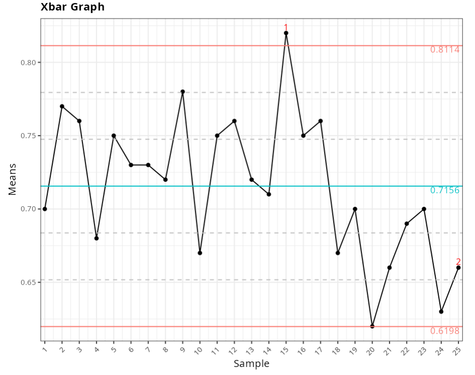 | 25 | 0.804 | 2 of 3 consecutive points greater than 2 sigmas from the center line |