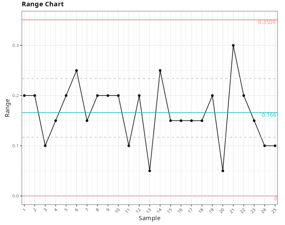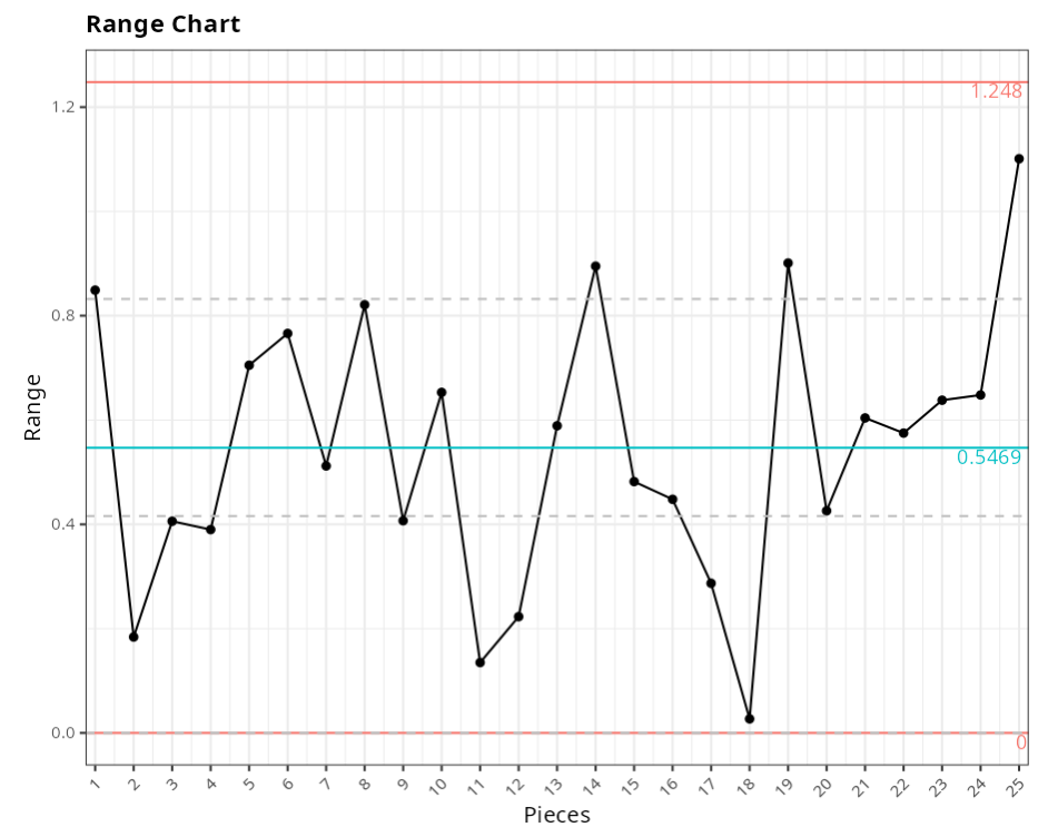 Let’s consider sample data on the length of pieces in subgroups of size 5.