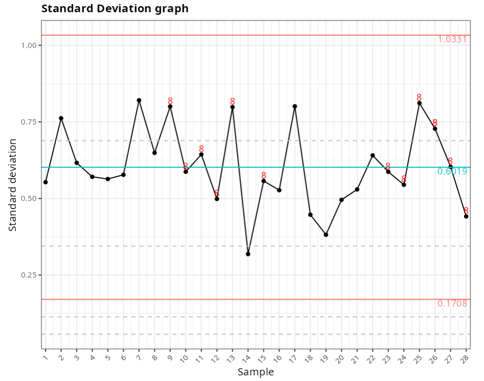 | 26 | 0.728 | Eight or more consecutive points greater than 1 sigma from the center line |