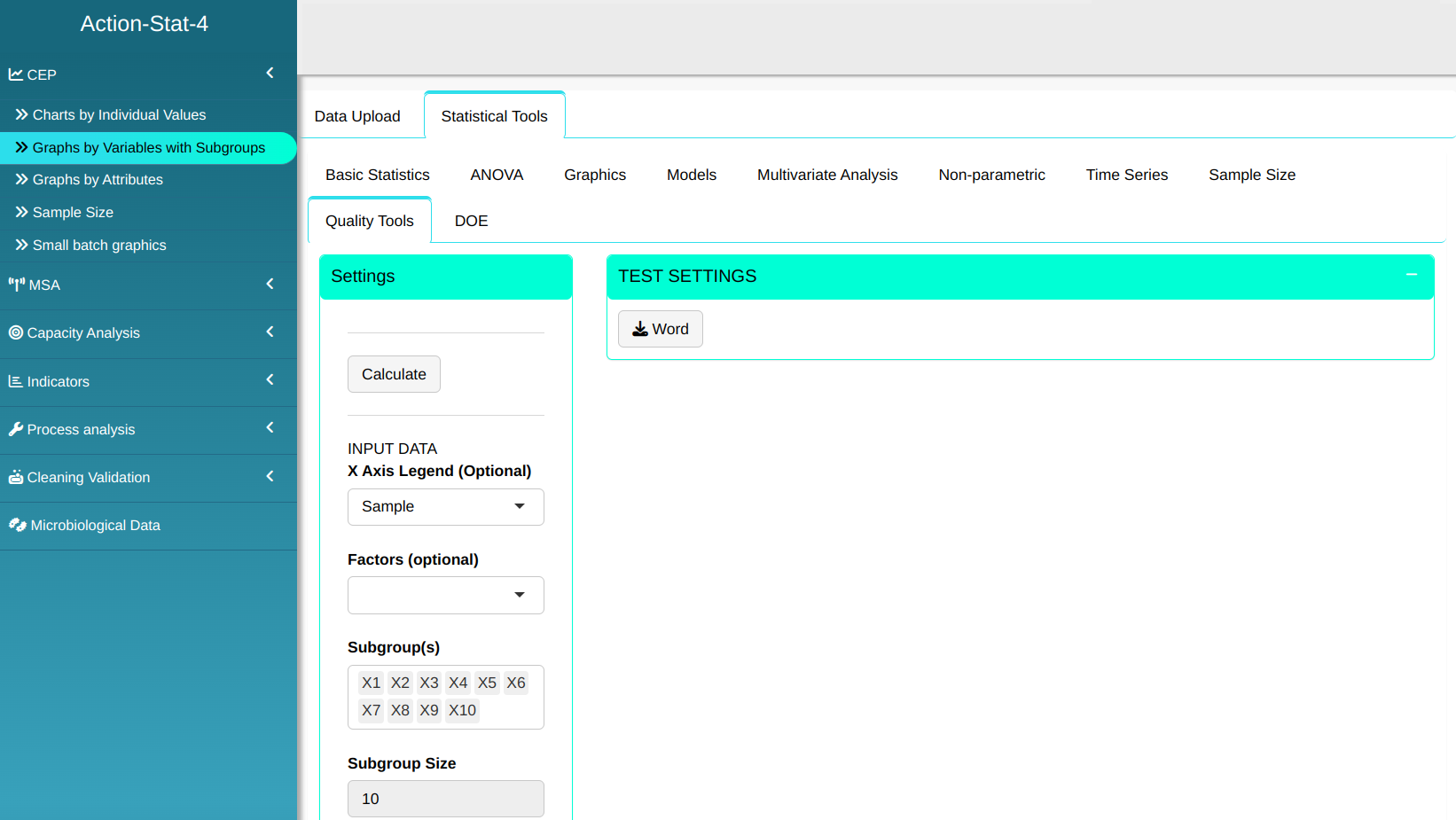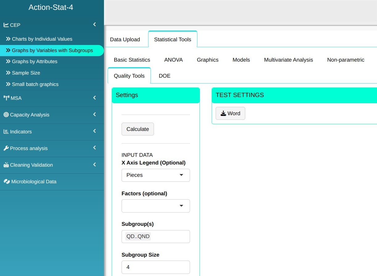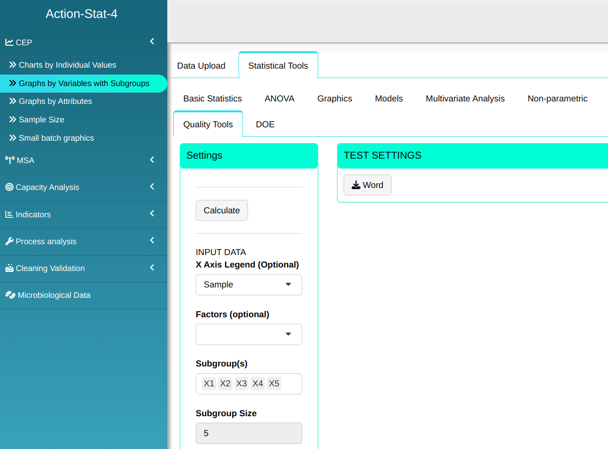 “ACTION” provides the Charts by Variables with Subgroups tool that allows you to generate Mean and Amplitude ($\overline{X}$ and R) Mean and Standard Deviation ($\overline{X}$ and S) graph and Individual Values Graphs with Variation Between and Within Groups (I-MR-R or I-MR-S).