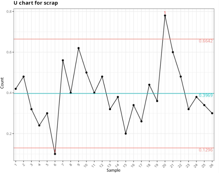 | 23 | 0.48 | 1 point greater than 3 Sigmas from the center line |