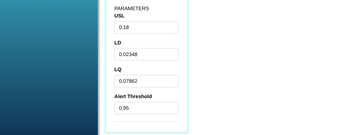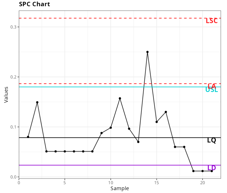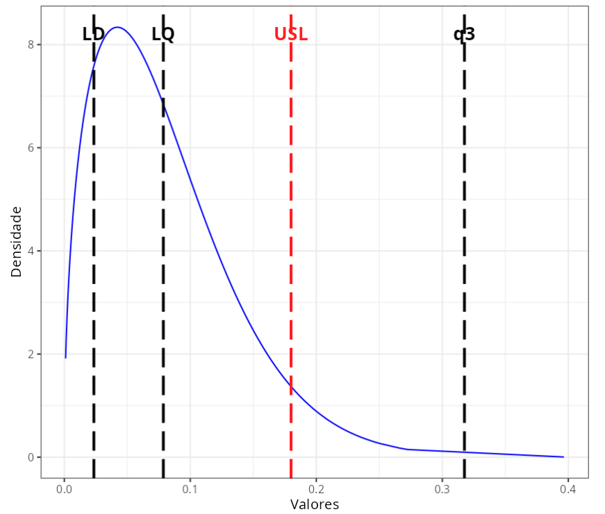 In a pharmaceutical industry, there is interest in evaluating the performance and stability of the amount of residues after cleaning the equipment. The equipment that measures the residues detects values above LD = 0.02348 and can quantify values above LQ = 0.07862. The upper specification limit for this case is USL = 0.18.