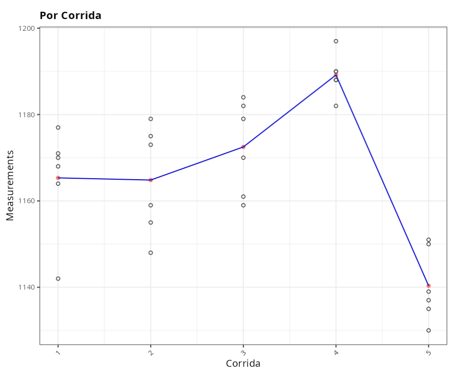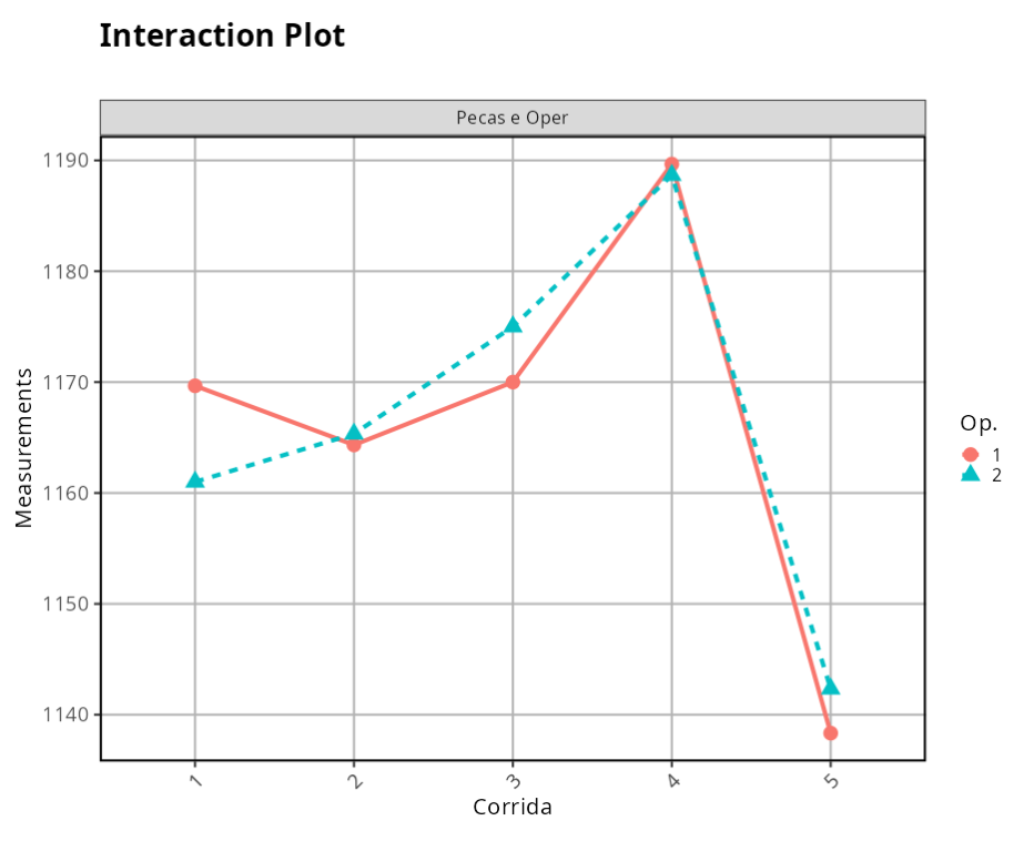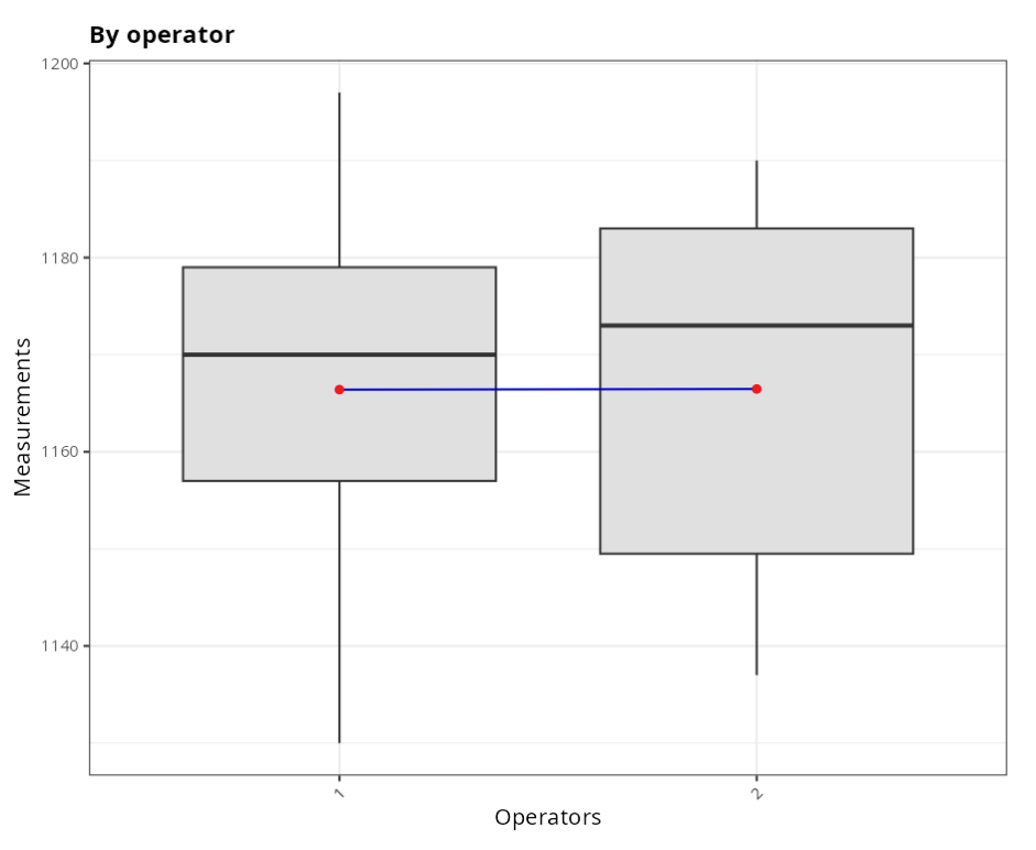 Next we consider the tensile resistance characteristic carried out on steel specimens. Five runs of steel were selected, with little variability within runs and the natural variability of the (production) process between runs. Two operators were used with 3 measurements of each run per operator