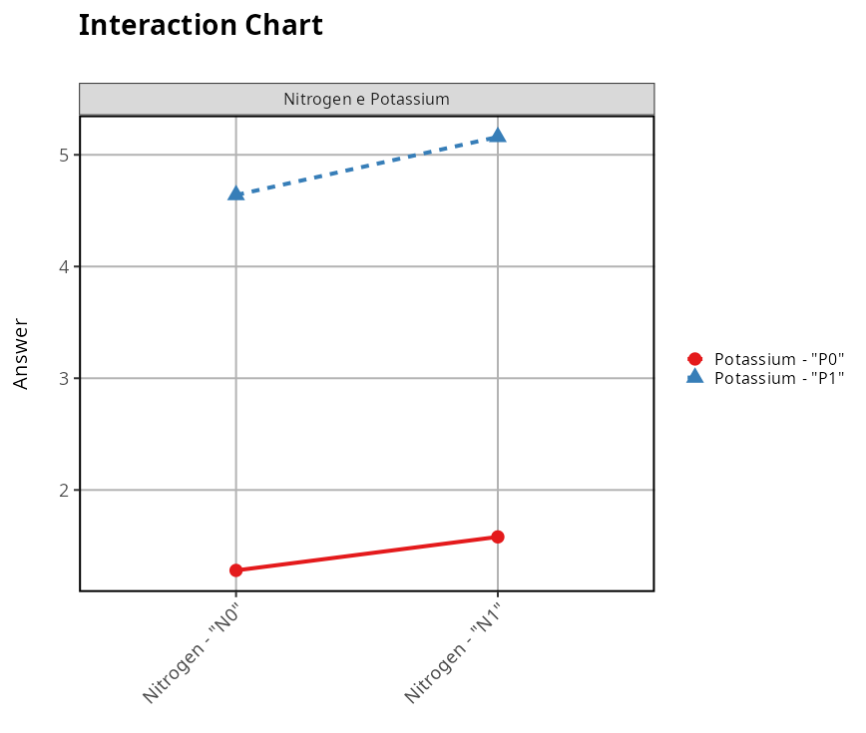 Here we see that there is no interaction between the two factors and their respective levels, that is, there is independence between them. Thus, regardless of the nitrogen level to be used, N0 or N1, the potassium level P1 will always provide better results.