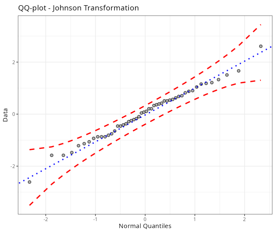 Data transformed using Box-Cox Transformation and Johnson transformations follow a normal distribution. This result can be confirmed by observing the p-value associated with the Anderson-Darling.
