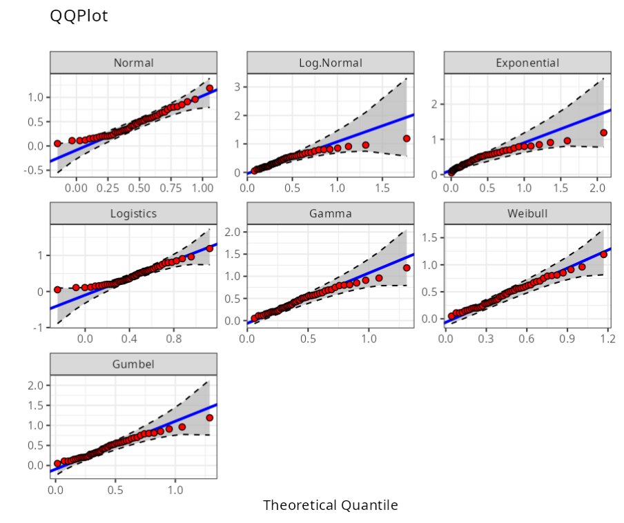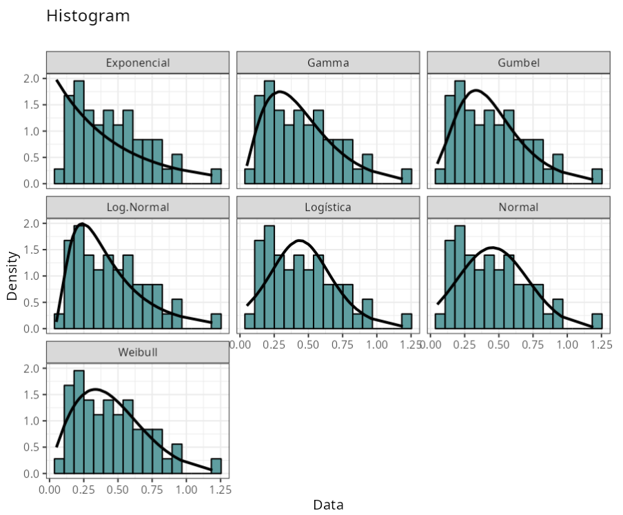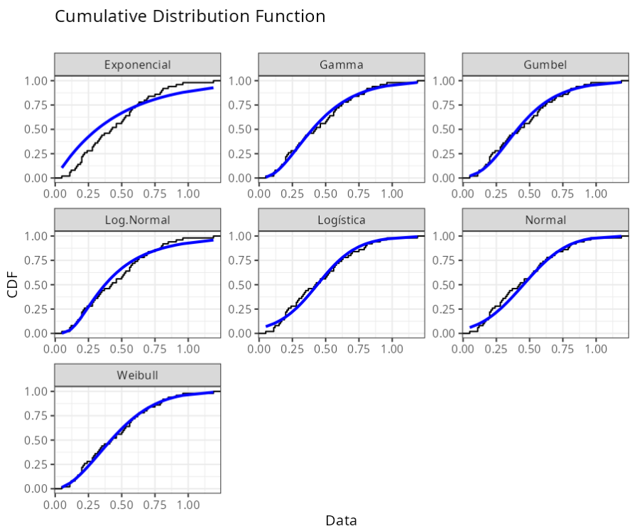 The table indicates that the data can be better fitted by all distributions except Exponential Distribution, which can be confirmed when we compare the p-value of the Anderson-Darling test with the level of significance of 0.05.