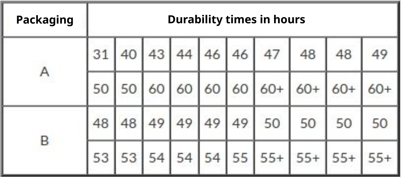 Is there a difference between the two packages in terms of product durability? Let’s compare the durability times using the Rank Test.