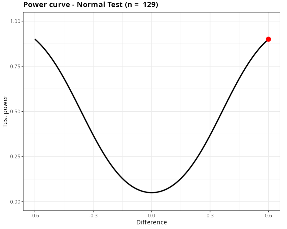 Therefore, for the test to detect a difference of 0.6 with a power of, at least 0.9, a sample size of 129 elements is required.