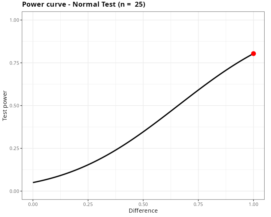 The production manager of a company aims to evaluate the performance of a new teaching methodology for new workers hired. With the old methodology, there is an average rate of 4 errors per worker in the first week of work. In a sample of 25 workers, the new methodology was applied and it was observed that the average was of 5 errors per week with a standard deviation of 2. With this information calculate the power of the test to detect a difference d = 0.25 between the true rate and the rate of the null hypothesis with a significance level $\alpha$ = 0.05.