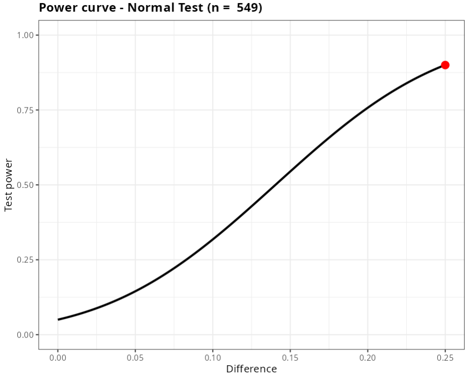 In other words, for the test to detect a difference d = 0.25 with a power of at least 0.9, we need to take a sample of 549 elements.