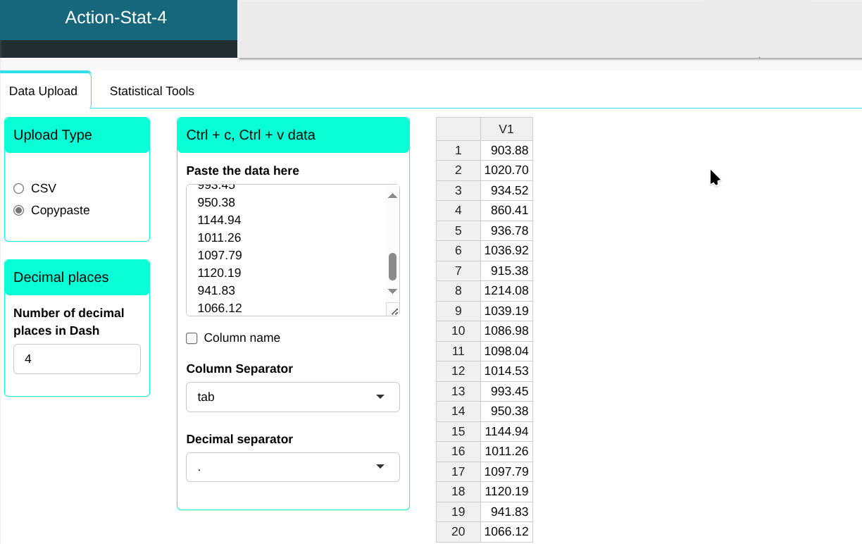 Using the Descriptive Summary tool in Action Basic Statistics menu, we find that the sample mean is $\overline{X}$=1019.3685 and the sample standard deviation is s = 91.36863255.