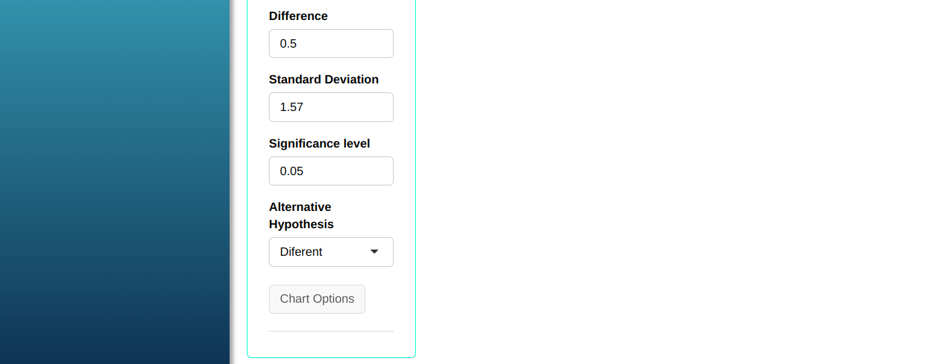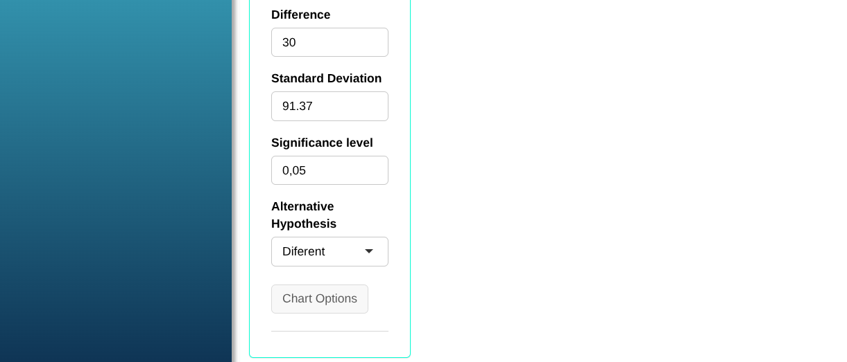| Poder | $\mathbf{\alpha}$ | Difference $\mathbf{(\mu_1 - \mu_2)}$ | Standard Deviation | |